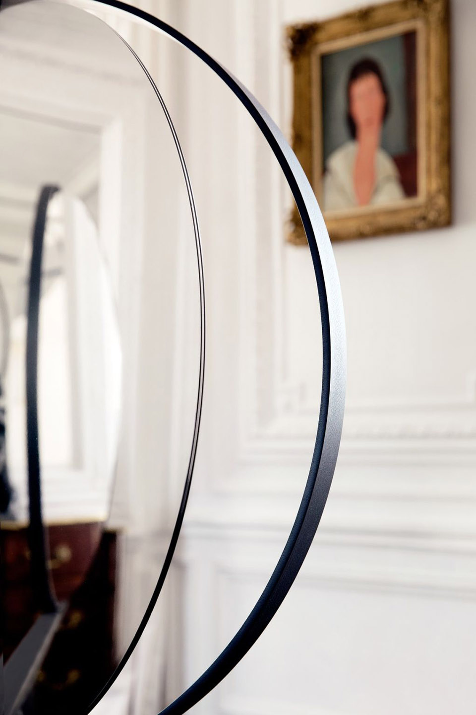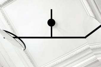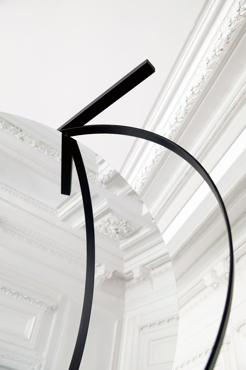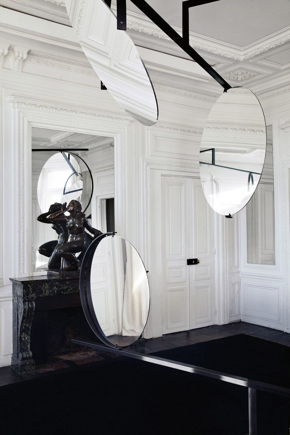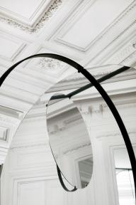 其中一個(gè)可動(dòng)臂從公寓全白的天花板上懸掛下來,另一個(gè)則被放置在地上。圓形的鏡子承受著張力,被連接在一個(gè)半圓弧的鋼結(jié)構(gòu)上,繞著它們共有的軸旋轉(zhuǎn)。當(dāng)可動(dòng)裝置旋轉(zhuǎn)時(shí),呈現(xiàn)出來的整體效果是一個(gè)讓人倍感振奮的不對(duì)稱的平衡。鏡子時(shí)不時(shí)地會(huì)反射到這個(gè)歷史久遠(yuǎn)的公寓的一角,有時(shí)候也會(huì)出現(xiàn)來訪者本身。當(dāng)鏡子排成一列,相互反射,重新組合空間時(shí),常常把三者結(jié)合在一起,無限倍增。觀賞者猶如穿梭在時(shí)空隧道之中感受著過去、現(xiàn)在和未來,但在空間和建筑般的雕塑的包圍下又倍感平靜。