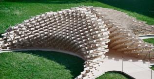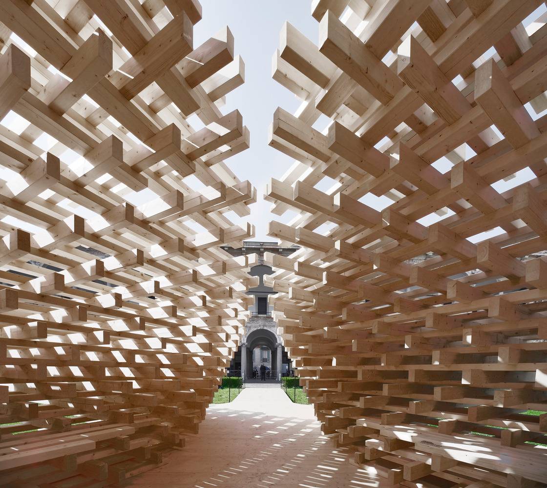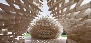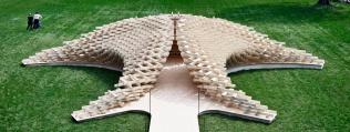 通過簡單地堆疊和旋轉不同長度的木棍,三個獨立的結構分支在逐漸變高,形成一個金字塔狀的集合體。游客可以進入?yún)⒂^并探索這個洞穴狀的裝置。