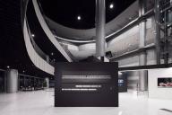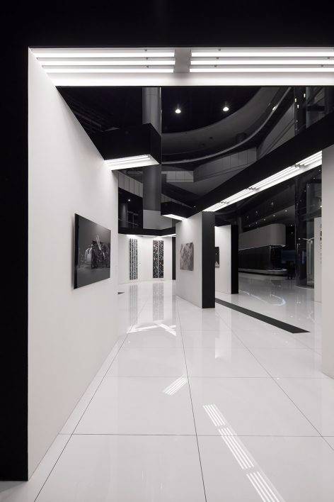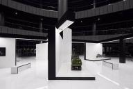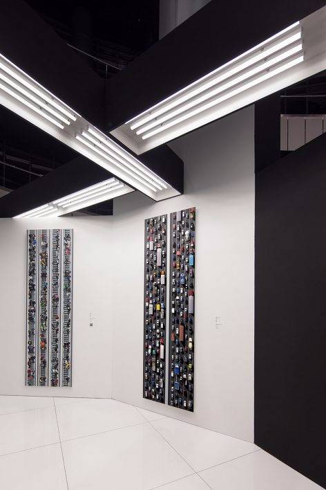 協(xié)調(diào)亞洲的展覽建筑通過引入移動的元素,規(guī)則/不規(guī)則以及分離的概念反作用于這些藝術(shù)作品。放射狀分布的墻體與展臺搭建起了類似網(wǎng)絡(luò)般的結(jié)構(gòu),與其上方的燈光條形成對比,光條看似打破了這些規(guī)律,卻同時將其緊密相連。大膽粗曠卻簡單至極的設(shè)計風(fēng)格營造出了強烈的視覺記憶印象的同時也為藝術(shù)作品提供了最佳的低調(diào)中性的呈現(xiàn)界面。