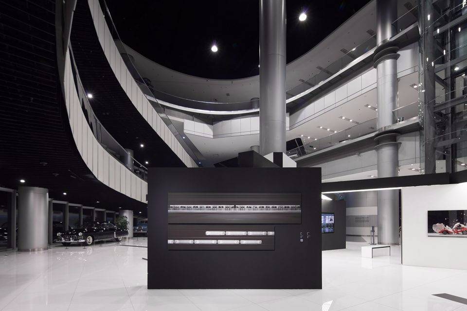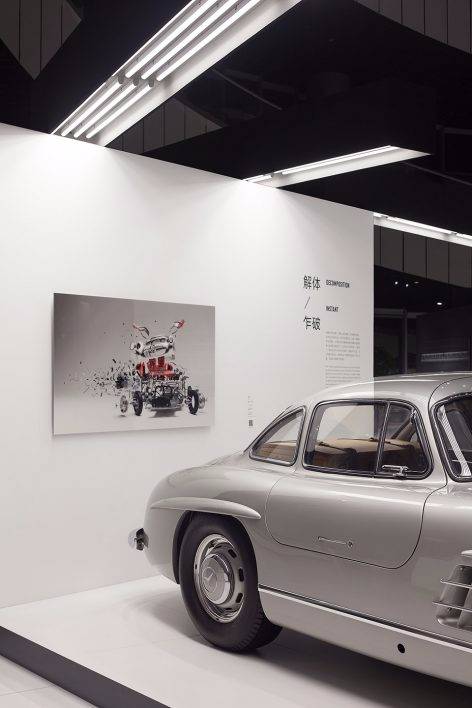 迎接參觀者的展品裝置是一輛來自博物館館藏的1955年奔馳300SL經(jīng)典車型,它與來自瑞士的藝術(shù)家費比安?奧夫納的跑車攝影作品“崩解”系列形成了鮮明的對比。當(dāng)300L帶著完美無缺的外觀與其支離破碎的版本相遇,后者表現(xiàn)了其完美軀殼內(nèi)的分崩離析的裝飾及機(jī)械組建。這一反差并存的形式,使得參觀者對于脆弱有了多元意義上的理解,同時也釋放了這樣一個信息:難以接近的令人贊嘆的物件變得平易近人起來。