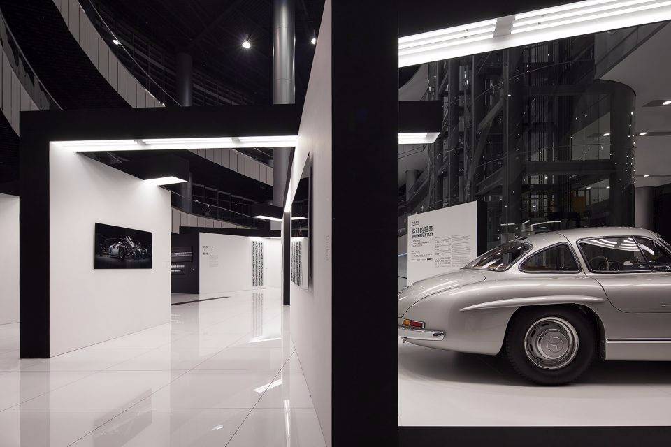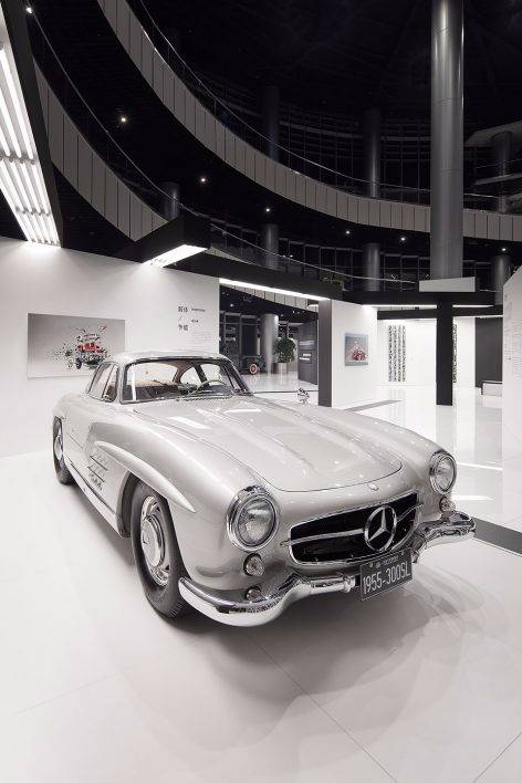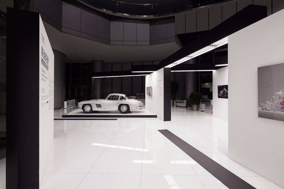 ▼迎接參觀者的展品裝置是一輛來自博物館館藏的1955年奔馳300SL經(jīng)典車型