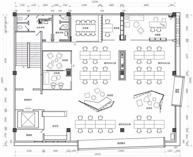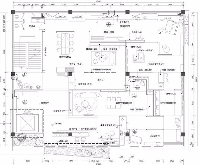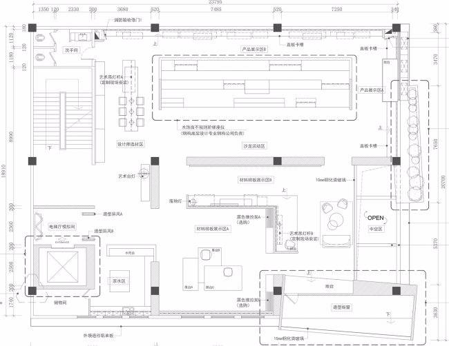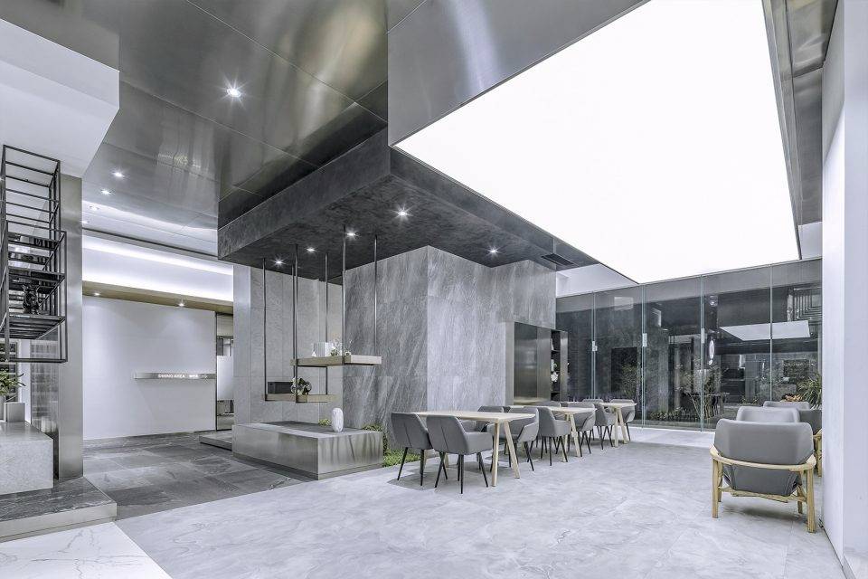 二層以產(chǎn)品選材區(qū)和設(shè)計師交流區(qū)為主。而當(dāng)推門開啟,順著樓梯視覺的延展,形成不被阻隔的開放動線,展示區(qū)有猶如畫廊展示,欣賞豐富立體空間層次之館,賞景心情瀏覽磁磚之美。在建筑外觀到一樓內(nèi)部延伸的中空位置,使得二樓空間還是有著室外的氛圍,與強(qiáng)調(diào)質(zhì)量和環(huán)境的花園里外相合,在洽談區(qū)品茶道之間,讓觀者悅心。