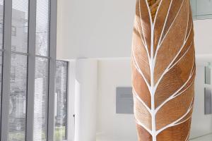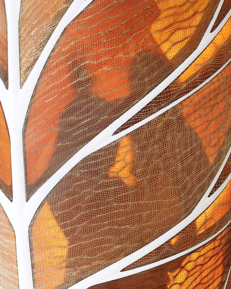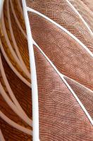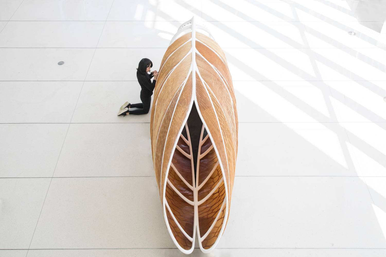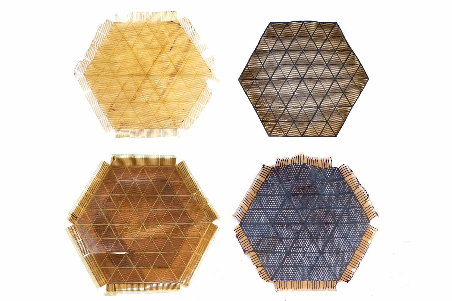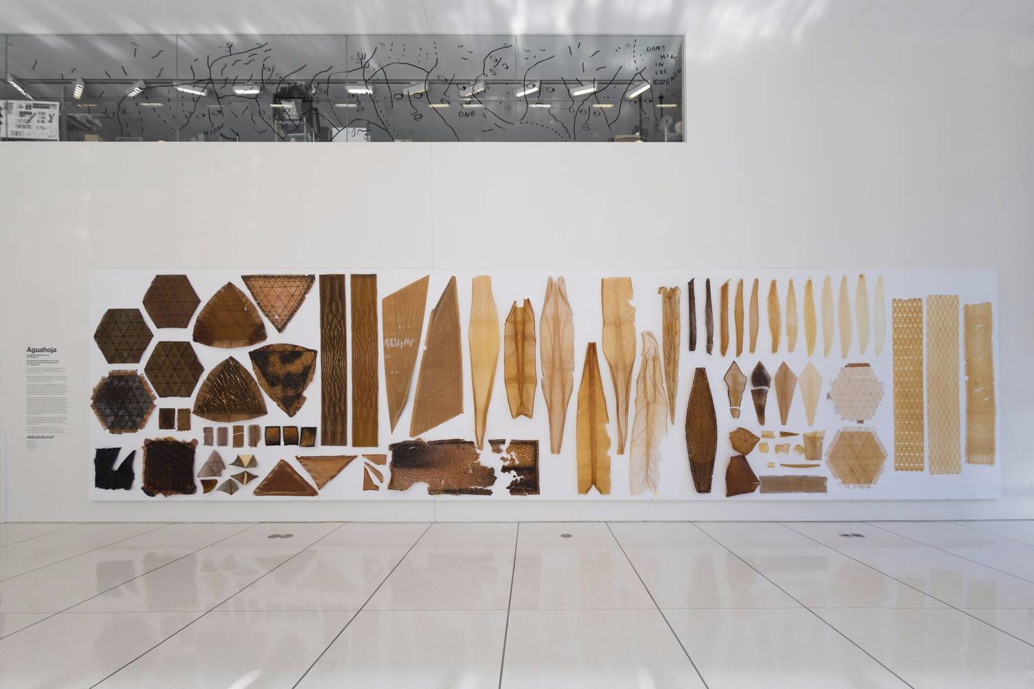 Aguahoja 藝術(shù)品- 這些作品展現(xiàn)的形式和行為特質(zhì)反映了它們?cè)诖笞匀恢械谋憩F(xiàn)方式,比如像甲殼素這樣的材料可以組成甲殼類的外骨骼和真菌的細(xì)胞壁。與鋼和混凝土不同,由這些材料制成的復(fù)合材料會(huì)持續(xù)地呼應(yīng)其環(huán)境。一些藝術(shù)品在響應(yīng)濕度和熱量時(shí)結(jié)構(gòu)會(huì)發(fā)生顯著變化,而另一些藝術(shù)品會(huì)隨著季節(jié)變化而變暗或變亮。有些藝術(shù)品脆弱而透明,具有玻璃質(zhì)感,而另一些則像皮革一樣柔韌。盡管它們表現(xiàn)出了多樣性的特質(zhì),但這些藝術(shù)品具有一個(gè)共同的品質(zhì):在它們的壽命范圍內(nèi),它們的特性是由濕度主導(dǎo)的;壽命結(jié)束后,它們會(huì)在水中降解并回到生態(tài)系統(tǒng)。