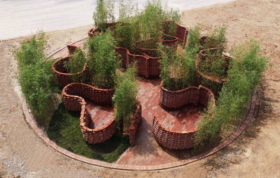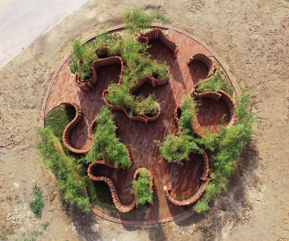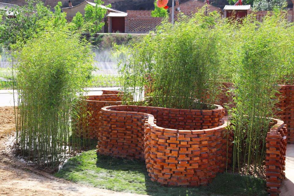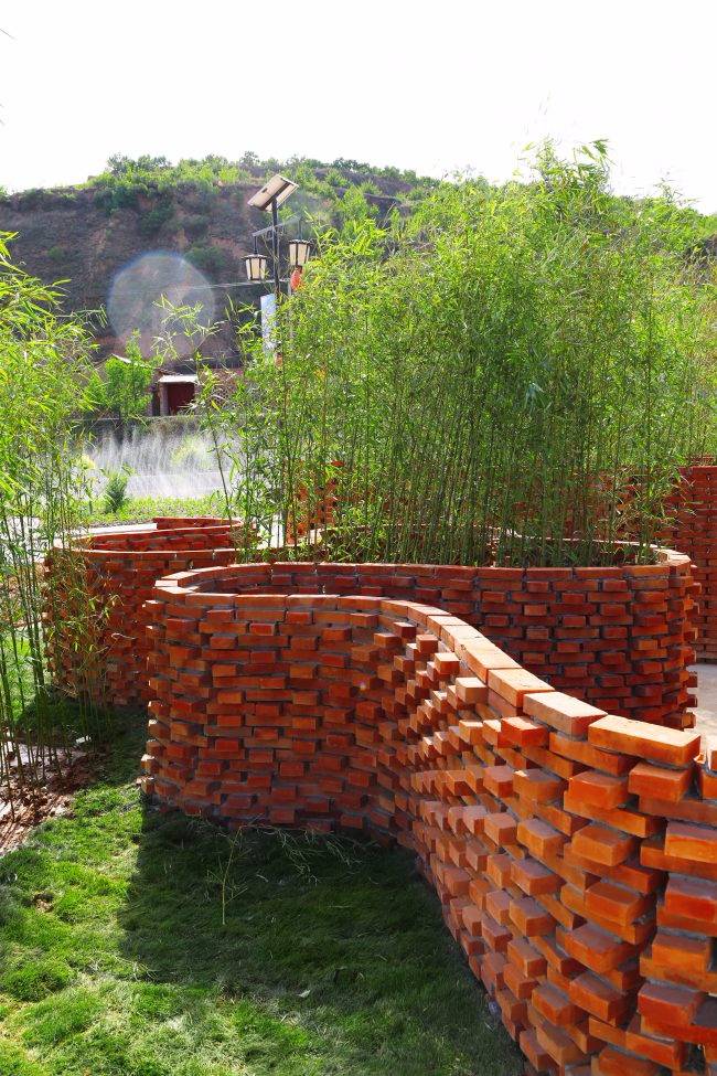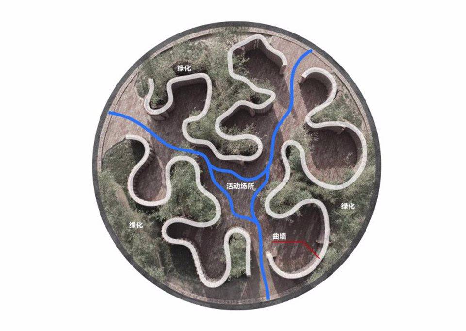 迷宮花園為一直徑13米的圓形用地,圓內(nèi)三條蜿蜒曲折的磚墻不僅在平面上形成復(fù)雜連續(xù)的褶皺空間,并且磚墻在豎直方向上也采用曲面形態(tài),加之磚墻的磚塊細(xì)部砌筑也凹凸變化,因而它成為空間及視覺(jué)的雙重迷宮;三條磚墻沿圓邊的外側(cè)空間用于種植竹子及草皮,其內(nèi)側(cè)空間則是居民活動(dòng)的場(chǎng)地,中國(guó)傳統(tǒng)陰和陽(yáng)的相生相對(duì)性在這里以復(fù)雜性呈現(xiàn)。