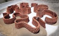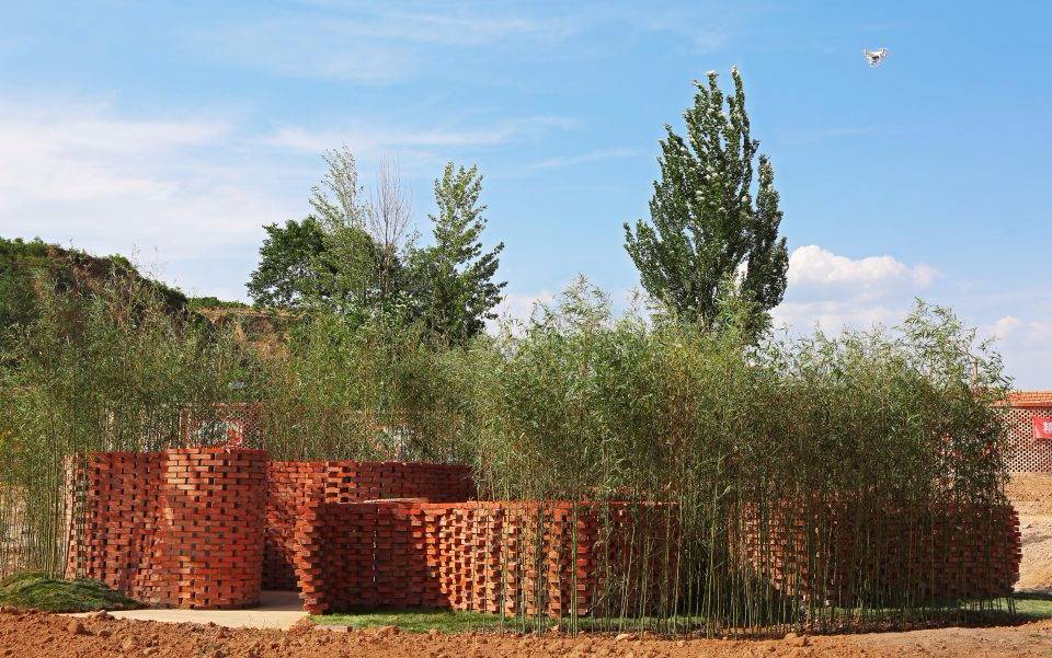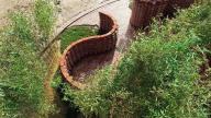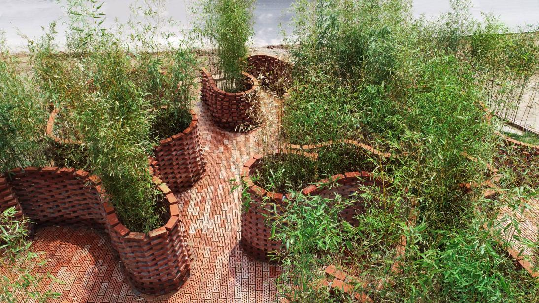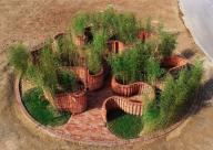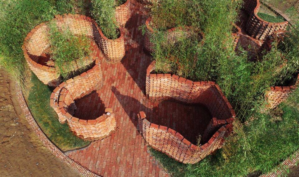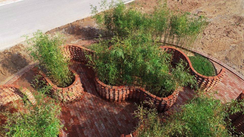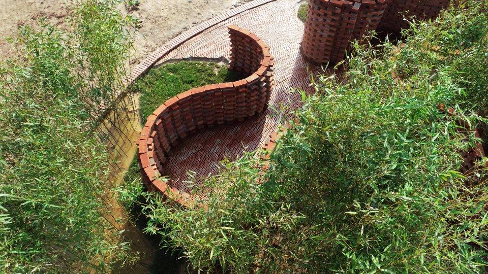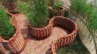 迷宮花園為一直徑13米的圓形用地,圓內(nèi)三條蜿蜒曲折的磚墻不僅在平面上形成復(fù)雜連續(xù)的褶皺空間,并且磚墻在豎直方向上也采用曲面形態(tài),加之磚墻的磚塊細(xì)部砌筑也凹凸變化,因而它成為空間及視覺(jué)的雙重迷宮;三條磚墻沿圓邊的外側(cè)空間用于種植竹子及草皮,其內(nèi)側(cè)空間則是居民活動(dòng)的場(chǎng)地,中國(guó)傳統(tǒng)陰和陽(yáng)的相生相對(duì)性在這里以復(fù)雜性呈現(xiàn)。