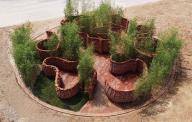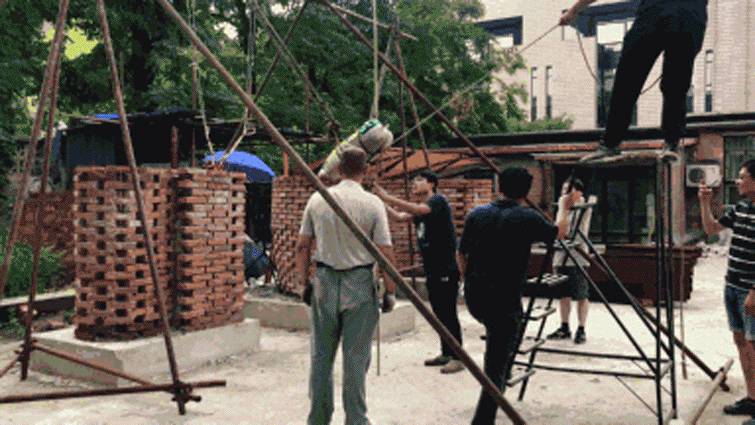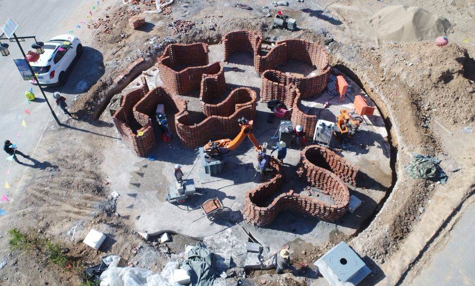 實(shí)際建造過(guò)程包括施工放線、基礎(chǔ)施工、墻體砌筑、綠化種植、以及地面鋪裝等階段。施工放線使用了全站儀;基礎(chǔ)施工時(shí),用機(jī)器臂熱線切割泡沫填充曲墻外側(cè)綠化用地,該泡沫同時(shí)作為外模,花園的磚墻底部及活動(dòng)場(chǎng)所采用了鋼筋混凝土基礎(chǔ)底板(板厚30公分)?!皺C(jī)器臂自動(dòng)砌筑系統(tǒng)”用于墻體的砌筑時(shí)至少需要兩位工作人員,其中一位進(jìn)行該系統(tǒng)的操作,另一位負(fù)責(zé)傳遞砂漿及磚塊;機(jī)器臂的移動(dòng)采用了叉車定位搬動(dòng),每次搬動(dòng)后需要進(jìn)行機(jī)器臂定位校準(zhǔn),以保證施工精度。墻體完工后,去除磚墻外側(cè)地面的泡沫并填充種植土,進(jìn)行竹子及草皮種植;同時(shí)進(jìn)行花園磚墻內(nèi)測(cè)活動(dòng)場(chǎng)地的地面鋪砌。