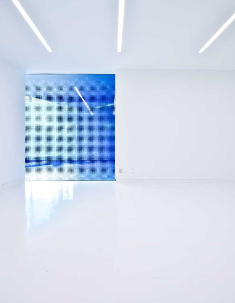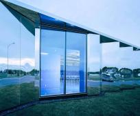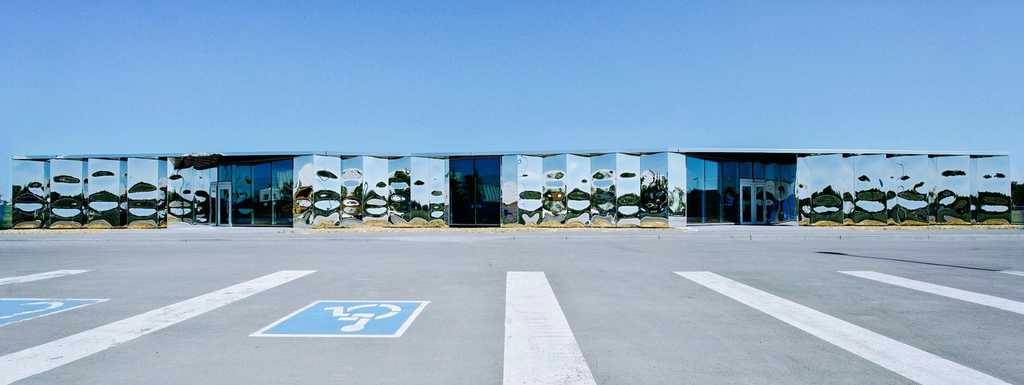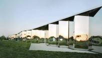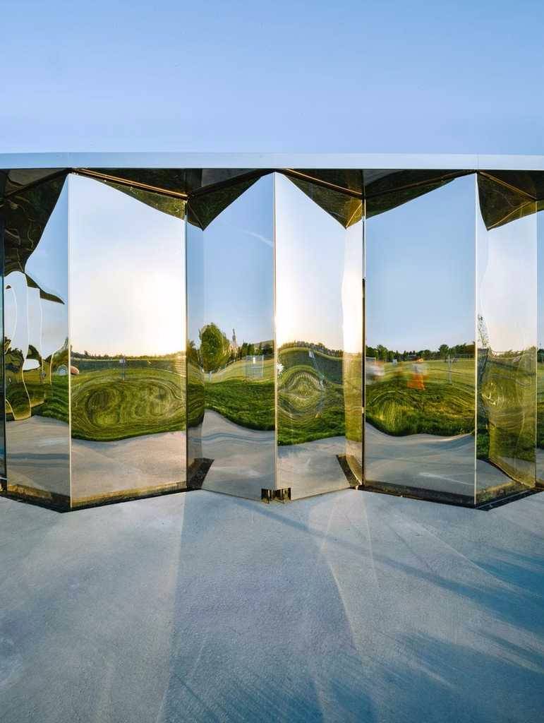 類似手風(fēng)琴的外墻被水平的屋頂平面拉緊。面板的淺150毫米深度是通過(guò)入口的大懸臂上的倒置屋頂系統(tǒng)和其余部分的傳統(tǒng)屋頂系統(tǒng)的組合來(lái)實(shí)現(xiàn)的。拋光不銹鋼面板和拱腹有助于展館不間斷的反射。