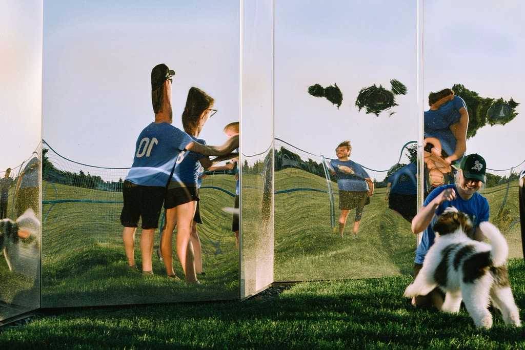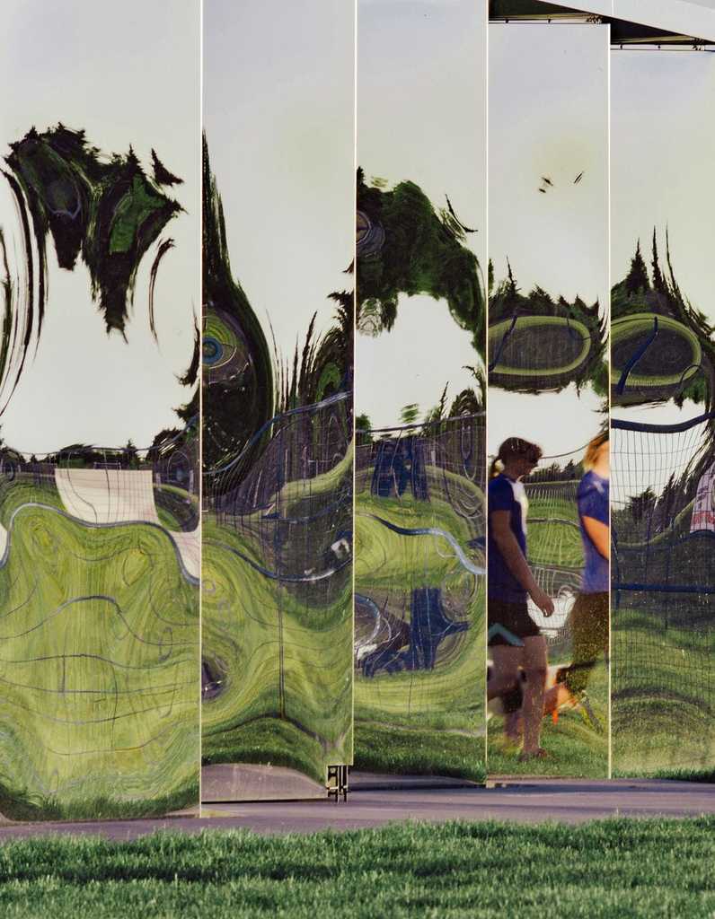 表面加工和彎曲特征突出強(qiáng)調(diào)了bar的形式——一個(gè)鏡像亭,提供了對(duì)其周圍環(huán)境的破碎和扭曲的反映。作為景觀中的一個(gè)物體,展館在將各個(gè)運(yùn)動(dòng)場(chǎng)直接連接到它的南北方面有著重要的作用。兩個(gè)色彩強(qiáng)烈的門戶為用戶提供了過(guò)渡區(qū),并進(jìn)一步加強(qiáng)了整個(gè)建筑的聯(lián)系。