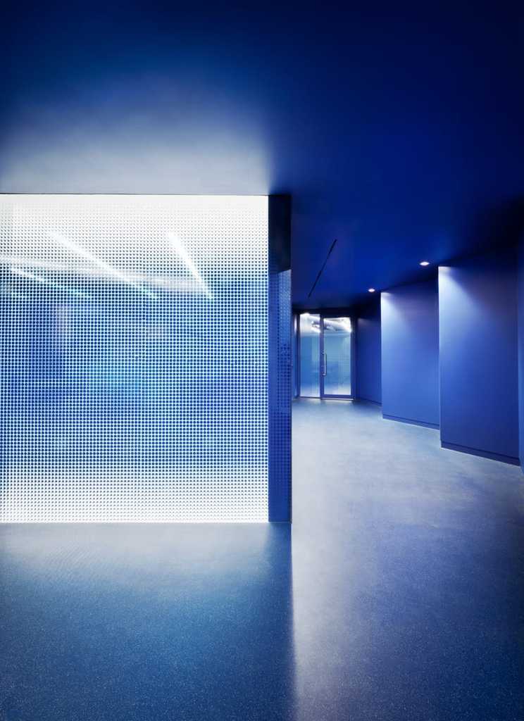 入口的顏色延伸到內(nèi)部,增強(qiáng)了建筑物的通透性。深度飽和的鈷藍(lán)色是對(duì)草原天空強(qiáng)度的反應(yīng),通過(guò)將使用者包裹在一個(gè)緊密的繭中,墻壁、地板和天花板似乎都變得無(wú)形,在室內(nèi)創(chuàng)造了一種改變的體驗(yàn)。建筑應(yīng)急裝置、凹進(jìn)的、涂漆的鋁底座和護(hù)角板以及光滑的皮質(zhì)層包覆的墻壁和長(zhǎng)凳的放置,為無(wú)縫的平面內(nèi)部表達(dá)做出了貢獻(xiàn)。門戶大廳、洗手間和海鷹區(qū)的地板上有耐用的回收橡膠襯里,以防止打滑。