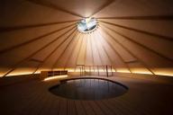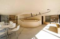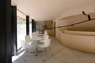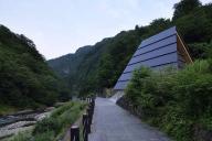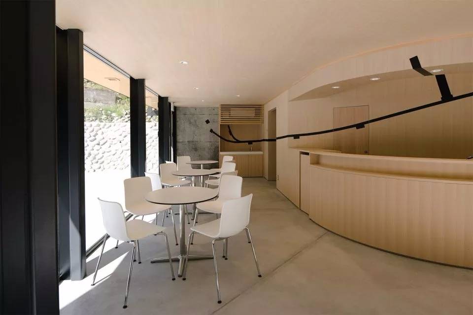 近隧道入口處,新建了一座符合當(dāng)?shù)仫L(fēng)貌的木屋,高聳的坡屋頂可以防止冬天的積雪。建筑物一層是紀(jì)念品商店及咖啡廳,展示出售當(dāng)?shù)卮迕竦氖止に嚻?,也可短暫休憩。二層的溫泉足浴池是一個(gè)暗空間,屋頂洞中的鏡面巧妙地將建筑外的峽谷及水流反射至空中,成為了天上的河流。