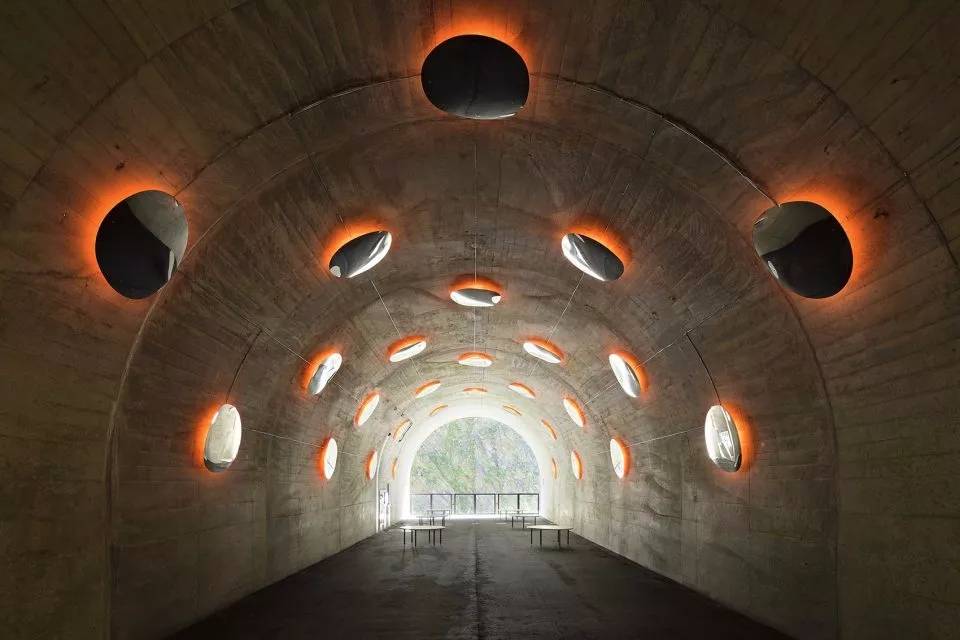 MAD改造的觀光隧道全長約750米,是當(dāng)?shù)?996年專為游覽日本三大峽谷之一的“清津峽”(日本三大峽谷之一)所建造。受中國古代哲學(xué)系統(tǒng)觀“五行”啟發(fā),MAD在隧道中的每處空間加上純粹的“一筆”,為每個(gè)空間帶來了獨(dú)特的神韻,一節(jié)一段讓人感受到不同的氛圍和張力。神韻合而為一,便成靈魂。被重新激活的隧道,就像是一出令人入神的情景劇,將時(shí)空拉開,帶人們抽離現(xiàn)實(shí),進(jìn)入想象之地。