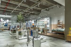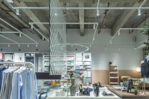 在全裸的毛胚基礎(chǔ)上進(jìn)行設(shè)計(jì)布置在不同的展示區(qū)域;一個(gè)臥室,一個(gè)服裝區(qū),主收款臺(tái),一個(gè)客廳,一個(gè)餐廳和一個(gè)綜合展示區(qū),入口處的吊燈,煙霧,產(chǎn)品展示墻在光線的照射下產(chǎn)生出一種微妙的秩序感。