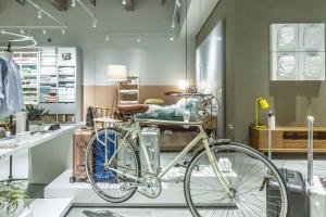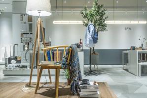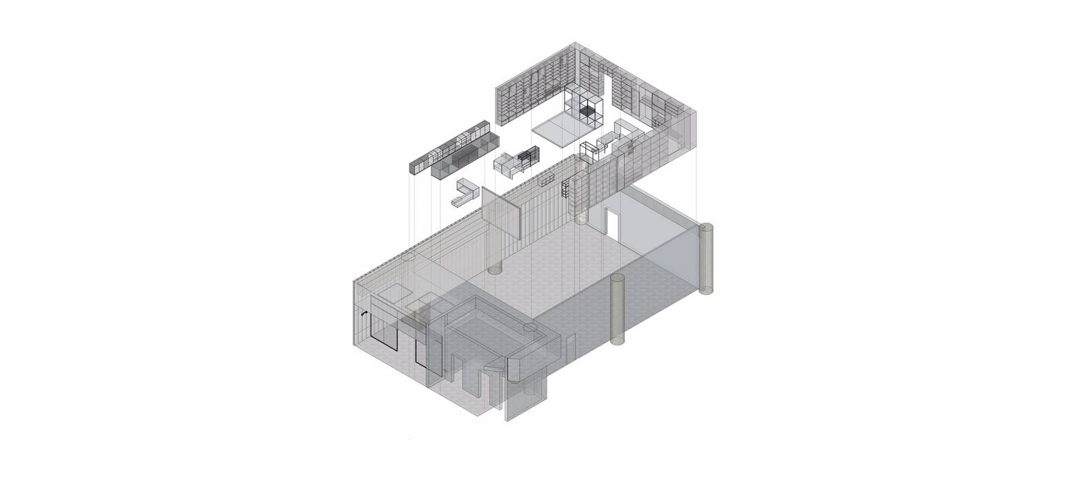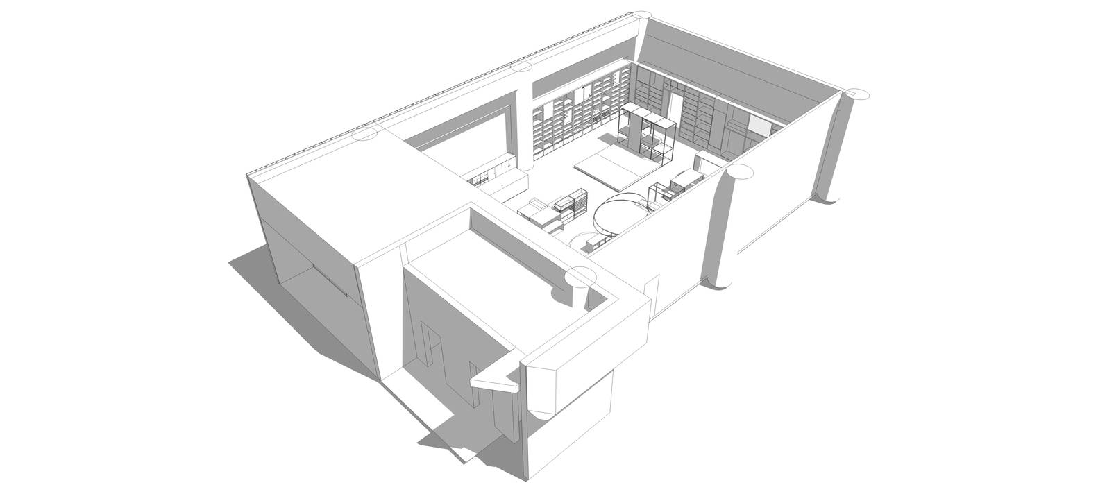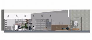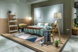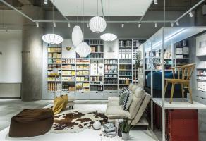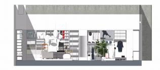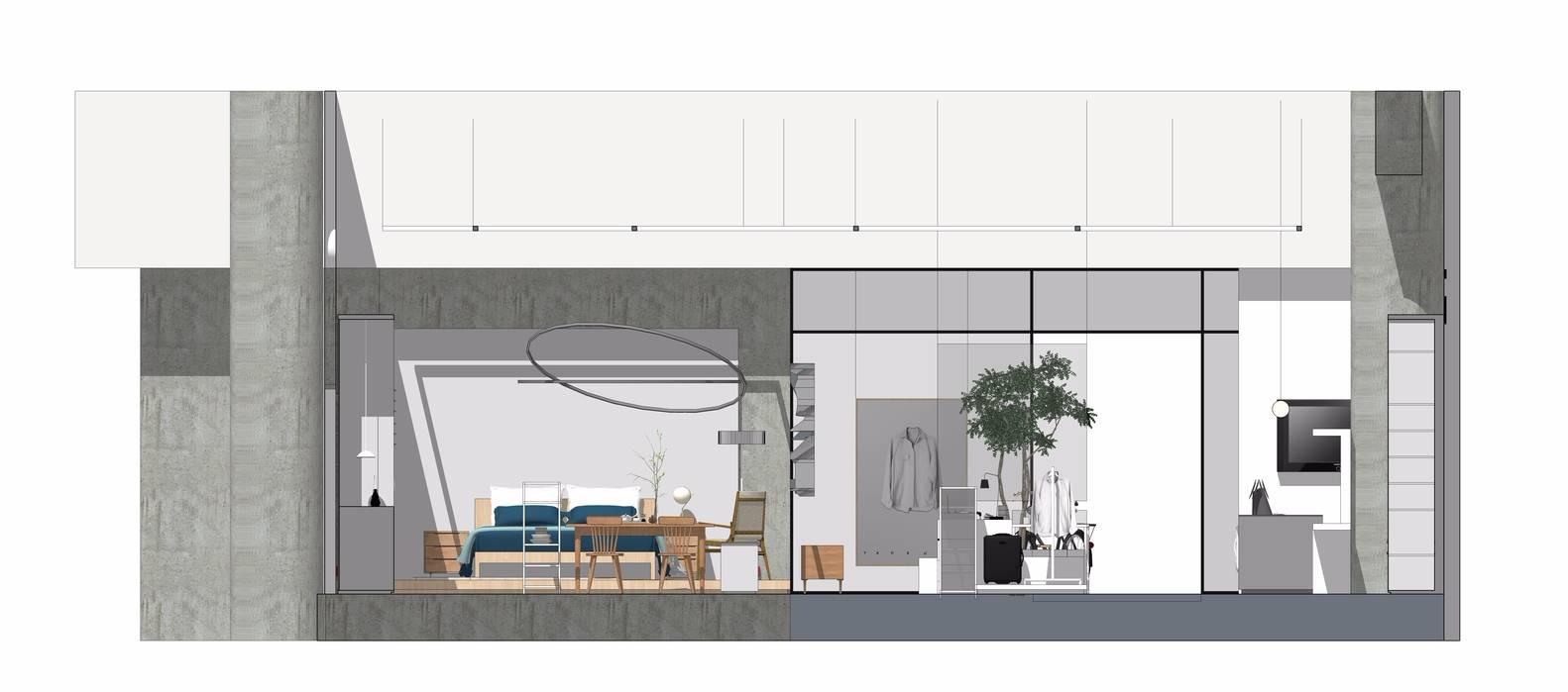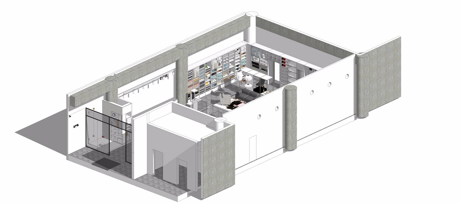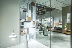 模塊化的展示方式貫穿著空間,通過(guò)這種方式展廳被劃分為項(xiàng)目要求的區(qū)域: 餐廳、客廳、臥室等。但整個(gè)空間都被一個(gè)灰色和貨架組成的包圍圈統(tǒng)一了。一旦進(jìn)入展廳,那種感覺(jué)就像進(jìn)入了一個(gè)家; 它的廚房、起居室和都是店面的一部分。通過(guò)不同的地臺(tái)分割,構(gòu)建出不同的空間秩序。