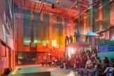 劇場同時也是社交地點(diǎn),更是享受展會多種節(jié)目的地方。除此之外,設(shè)計(jì)師還在天花板上懸掛了多個色彩鮮艷的透明薄板,既能提升空間,又起到了分隔作用。當(dāng)光線透過彩色板射入室內(nèi),色彩便隨之流向了展示空間的每個角落,在各個表面上跳躍,更加突出了展會關(guān)注的焦點(diǎn)——多樣性與集體性。