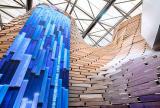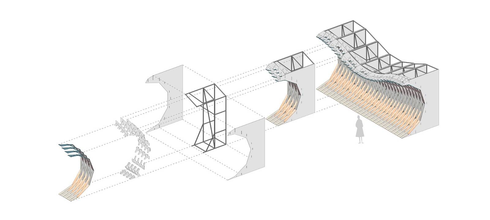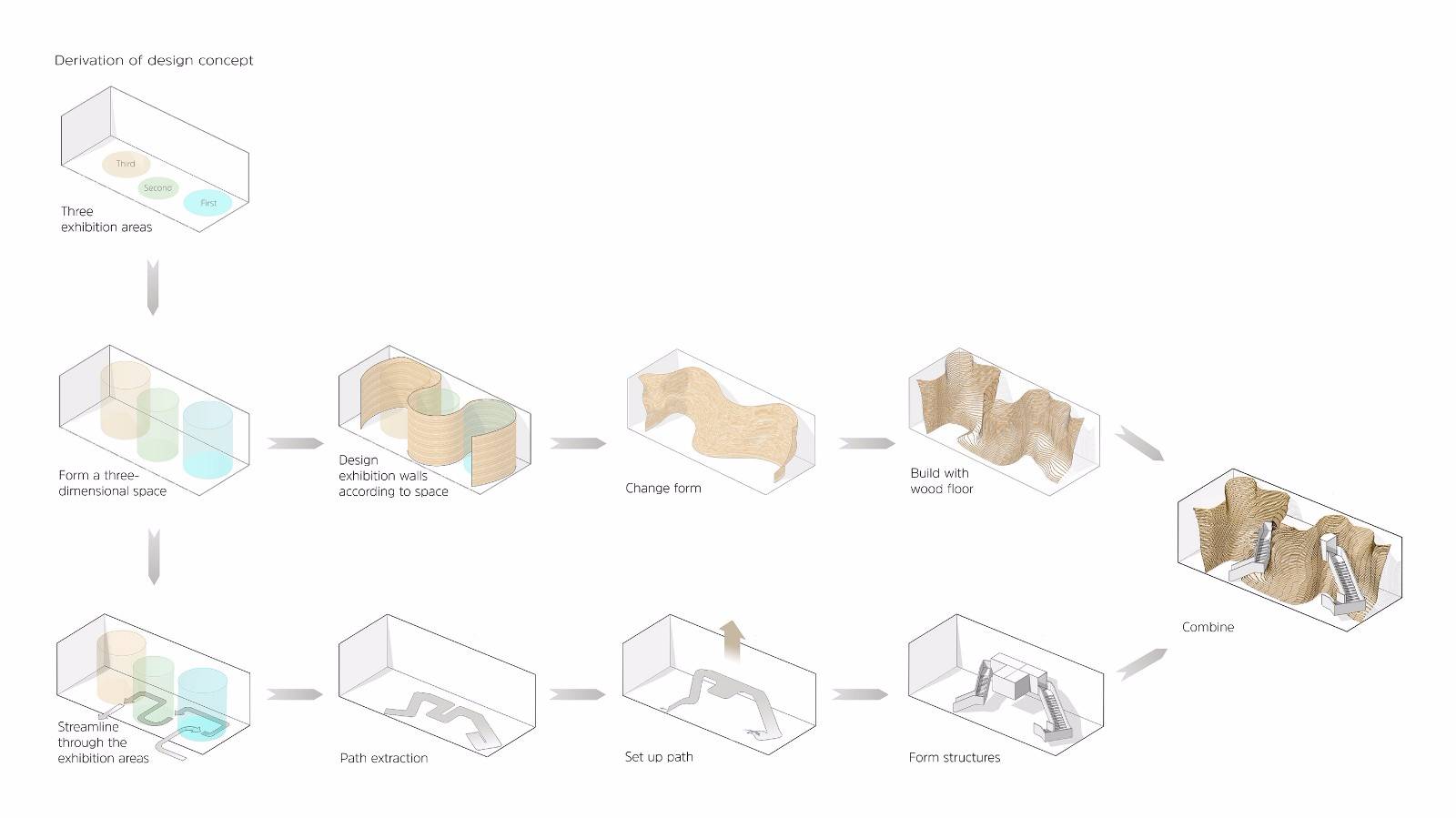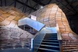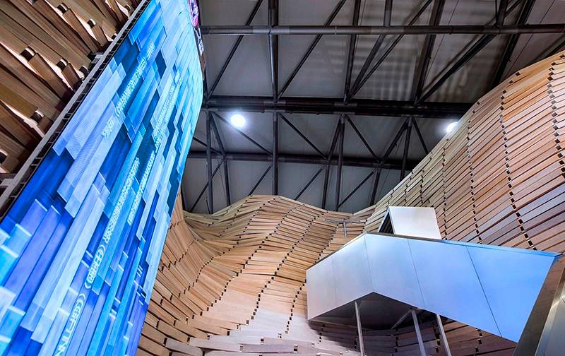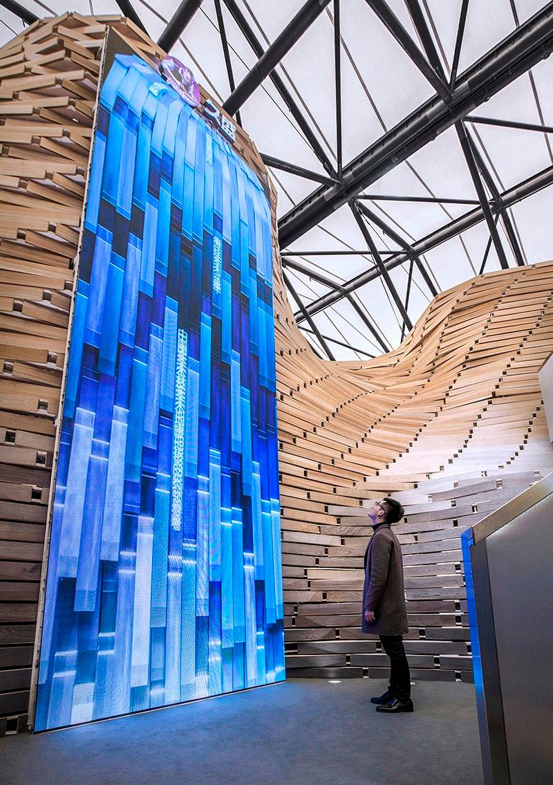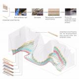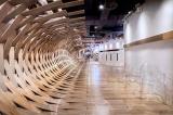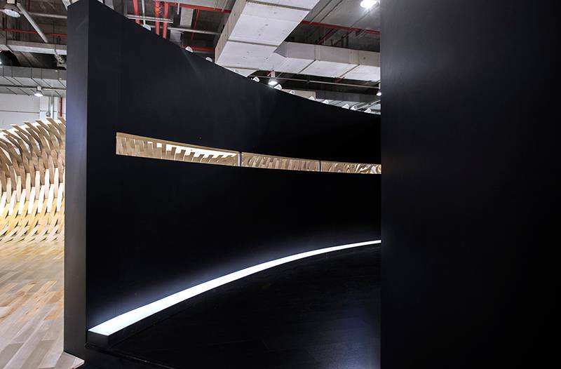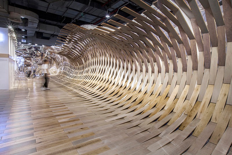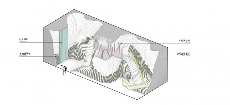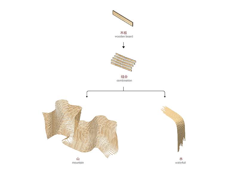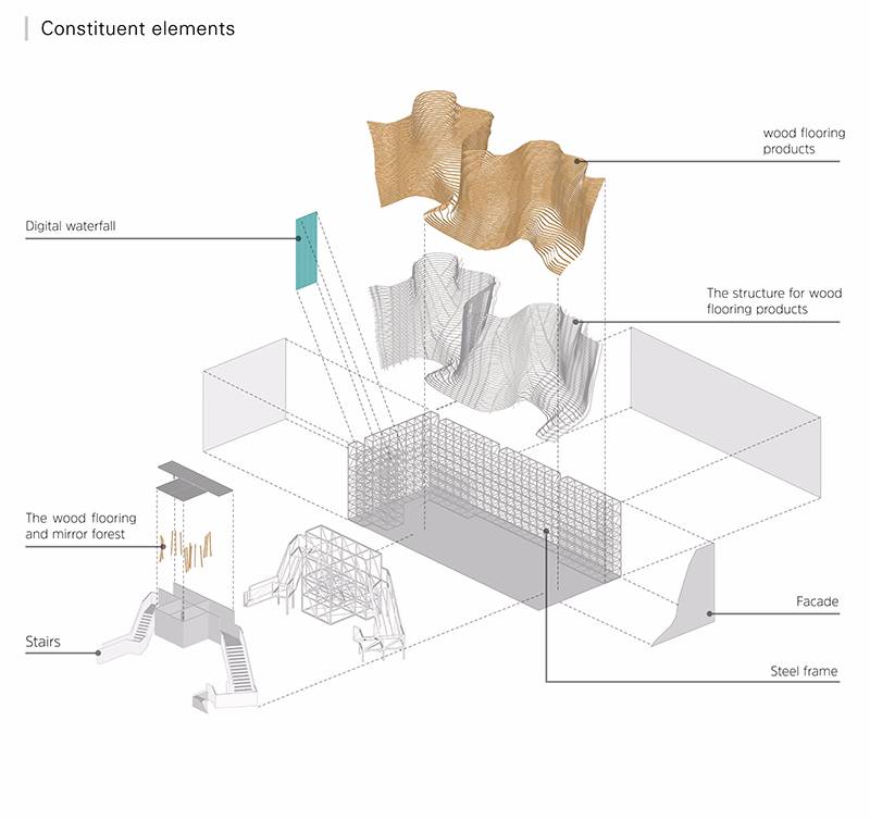 TOWOdesign從中國傳統(tǒng)的山水畫中提煉靈感,將地板產(chǎn)品的展示與游山玩水的體驗(yàn)進(jìn)行融糅。他們運(yùn)用參數(shù)化設(shè)計(jì)生成“木山”曲面,運(yùn)用程序進(jìn)行搭建構(gòu)件的分解,再借助數(shù)控機(jī)裝加工,將上千個(gè)地板部件組裝為“山體”。同時(shí)又利用多媒體技術(shù),將木板變成流動(dòng)的“水體”。