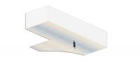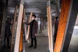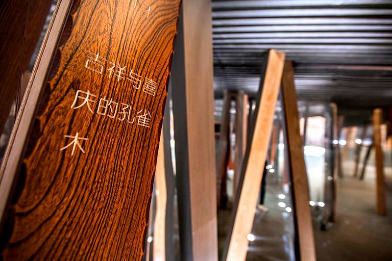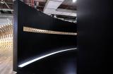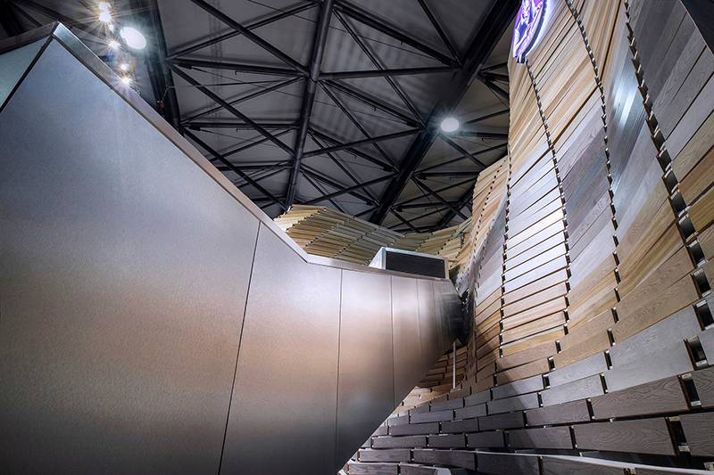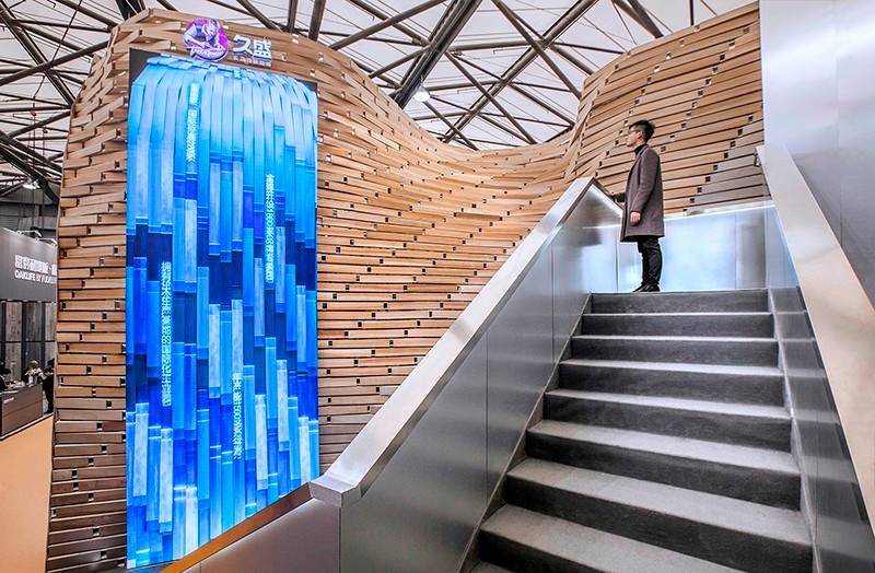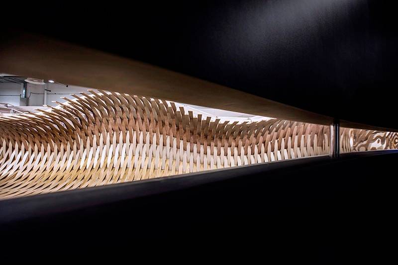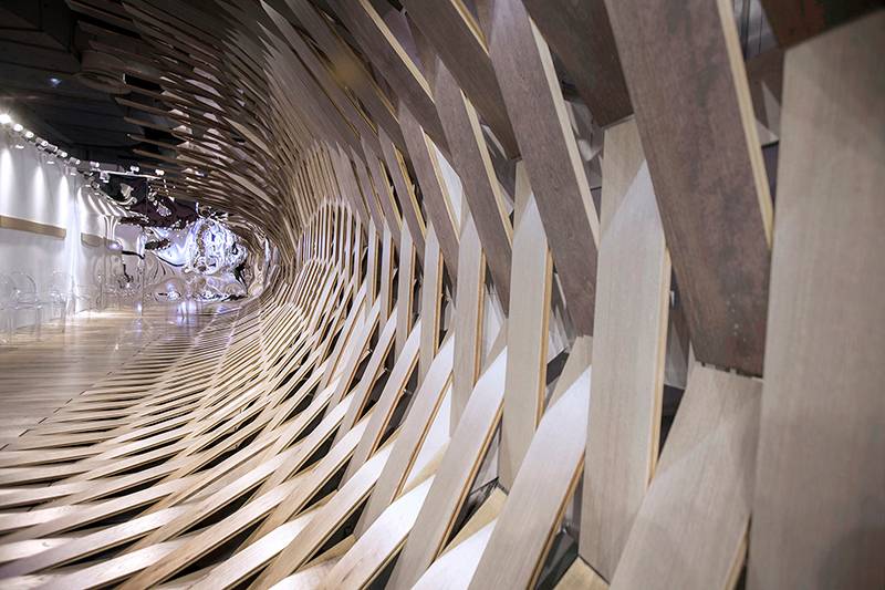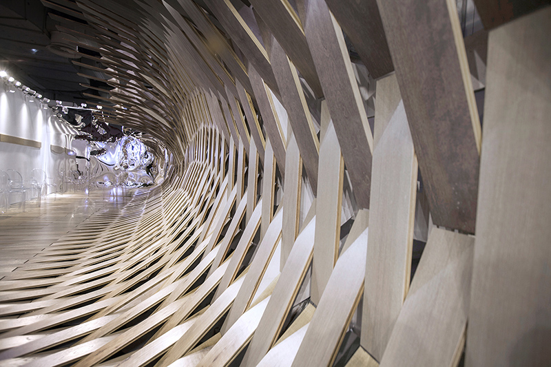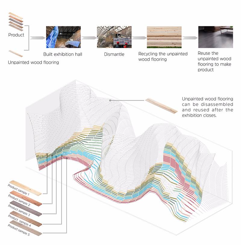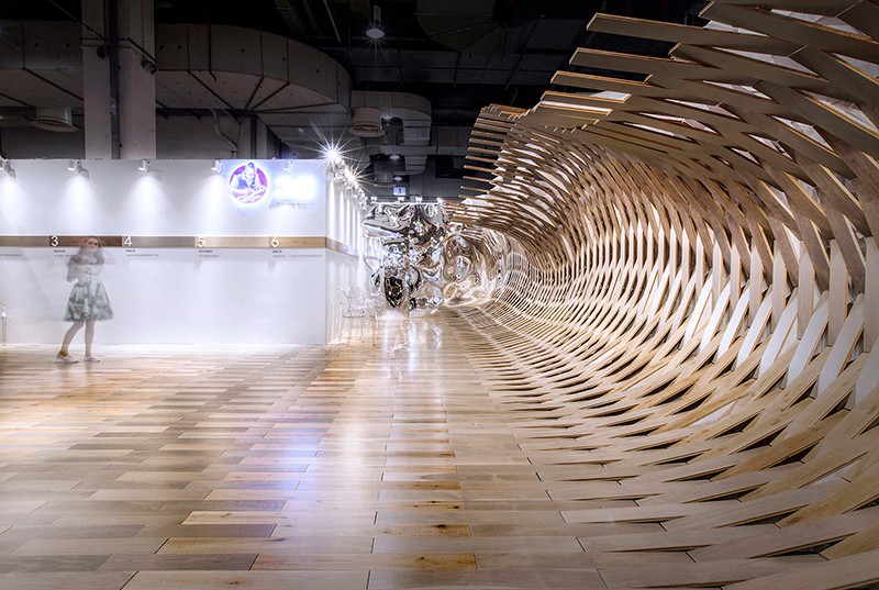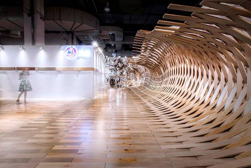 一道起伏奔涌的木色“水浪”橫亙于展館一側(cè),猶如被一股天外旋風(fēng)撩動(dòng)般從水平地面上騰空而起鋪卷開來。裝置背部以參數(shù)化設(shè)計(jì)搭建骨架,不同地板展品依據(jù)顏色深淺拼接交疊,呈現(xiàn)水紋律動(dòng)一般的空間節(jié)奏和木紋隨年月漸變的視覺色譜。裝置縱向兩端的鏡面借助反射作用構(gòu)成水浪的延伸,將有限的展廳進(jìn)行了無限的擴(kuò)展,同時(shí)又有一種夢幻迷離之感。