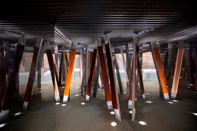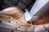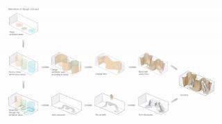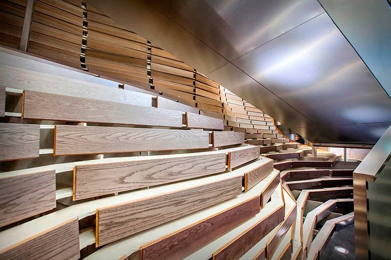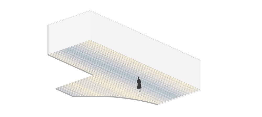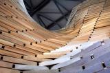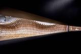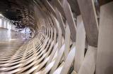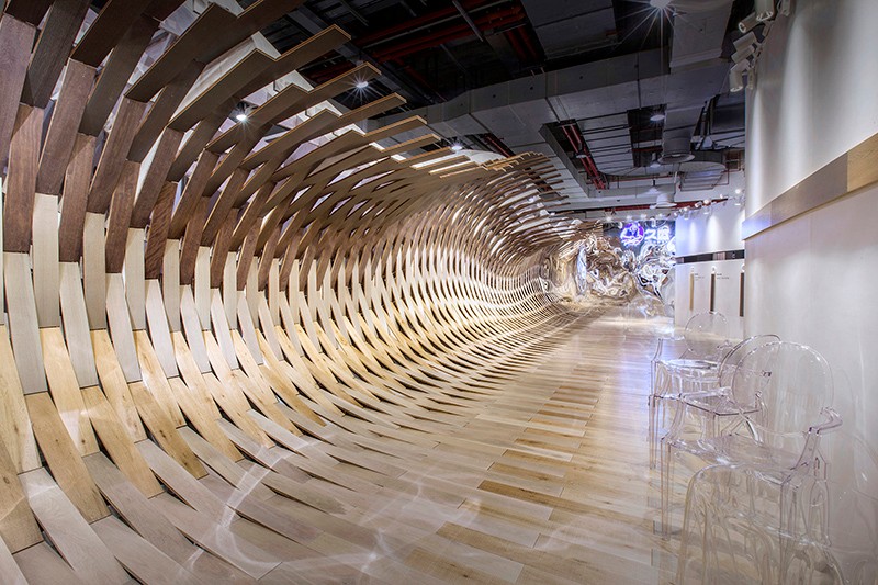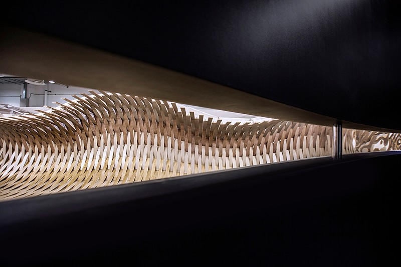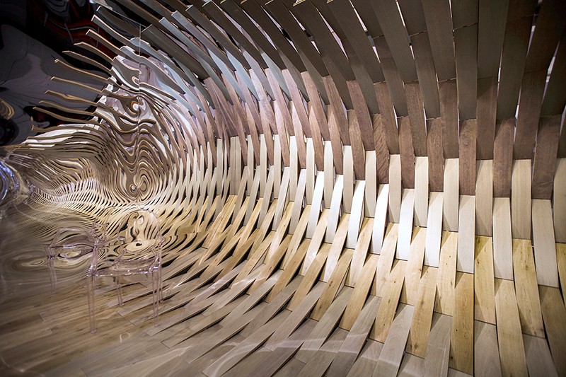 TOWOdesign又將水的美學(xué)潛質(zhì)再度延展,以充滿變幻的水流形態(tài)為靈感,打造出一幕極具視覺沖擊的雕塑。每一塊地板部件都被賦予液體形態(tài)的流動(dòng)旋律,但又包含著木質(zhì)的靜態(tài)紋理。