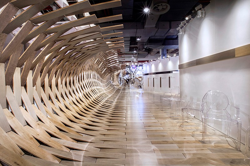 擅長在信息時(shí)代重構(gòu)商業(yè)空間的TOWOdesign堂晤設(shè)計(jì),為中國木地板品牌久盛打造了兩座顛覆式的展廳——通過展品、藝術(shù)、空間和時(shí)間的重組,將地板展覽轉(zhuǎn)換為美學(xué)意象的大型互動(dòng)裝置。