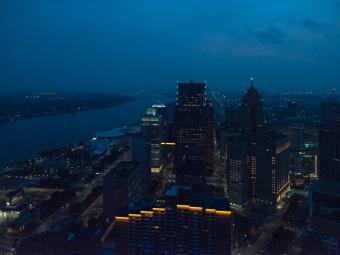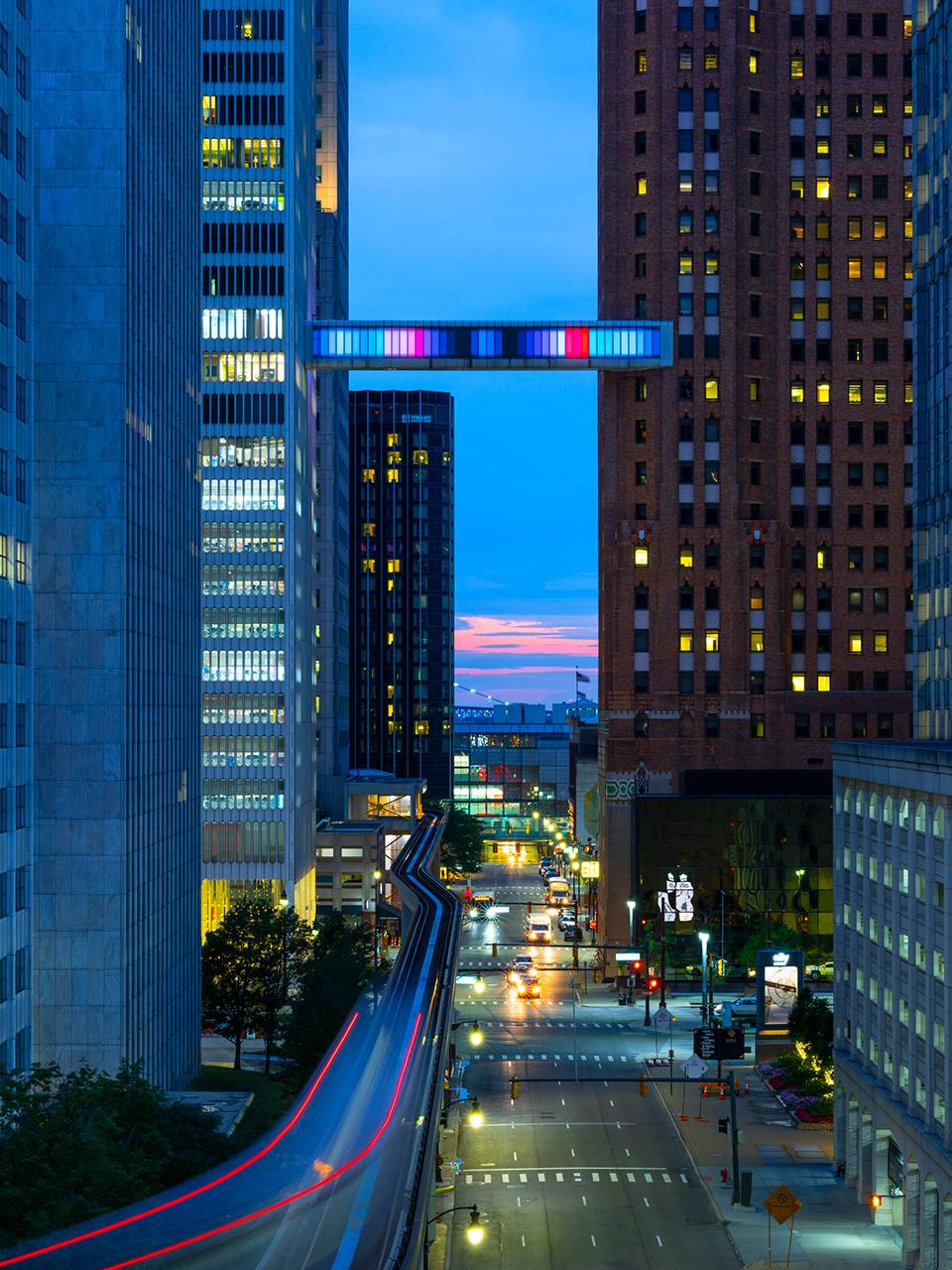 ▼走廊在底特律市中心街道的上空形成一道懸浮的光梁
