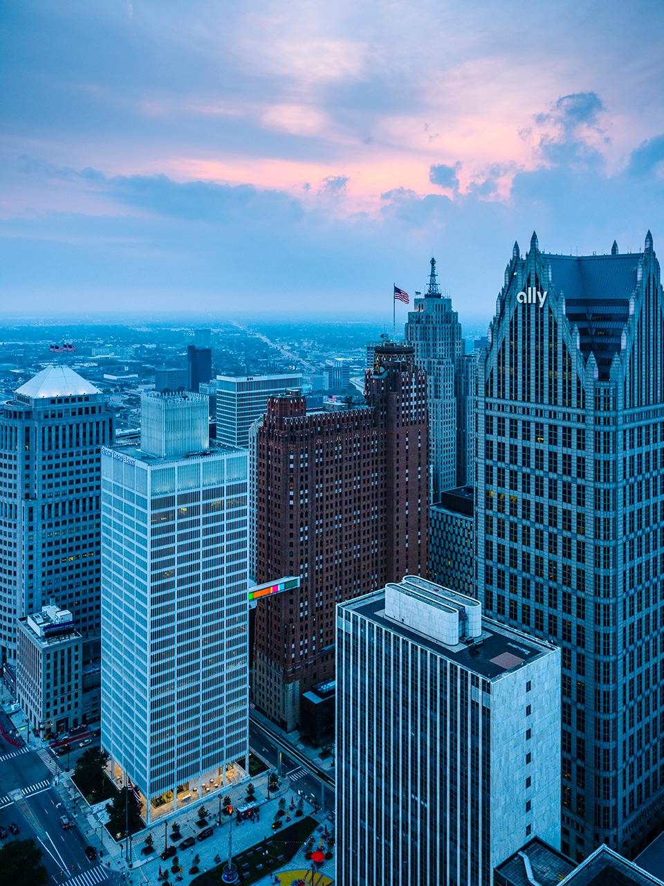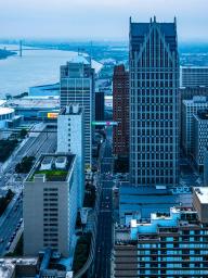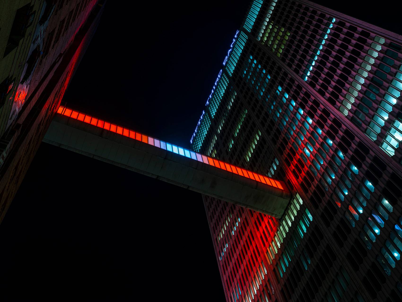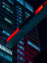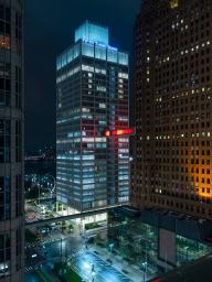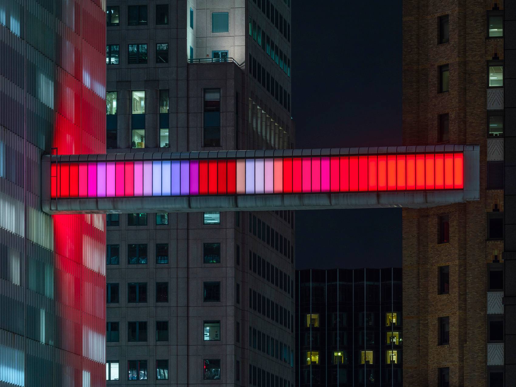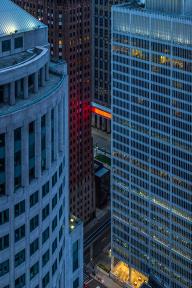 由藝術家Phillip K. Smith III創(chuàng)作的藝術裝置“Detroit Skybridge”位于由建筑師Gino Rossetti在1976年建造的空中走廊當中。這條長達100英尺、位于建筑16層的走廊連接了One Woodward大廈和Guardian大廈這兩座底特律最具標志性的建筑,在底特律市中心街道的上空形成一道懸浮的光梁。藝術家的靈感來源于1962年的山崎大廈,以及1929年建造的Guardian大廈內(nèi)部的彩色馬賽克磚墻。不斷變化和移動的光屏在城市的尺度下將藝術與建筑融為一體。Library Street Collective負責了該項目的概念生成及制作,并由 Bedrock Detroit, Quicken Loans Community Fund和Wayne County提供支持。