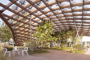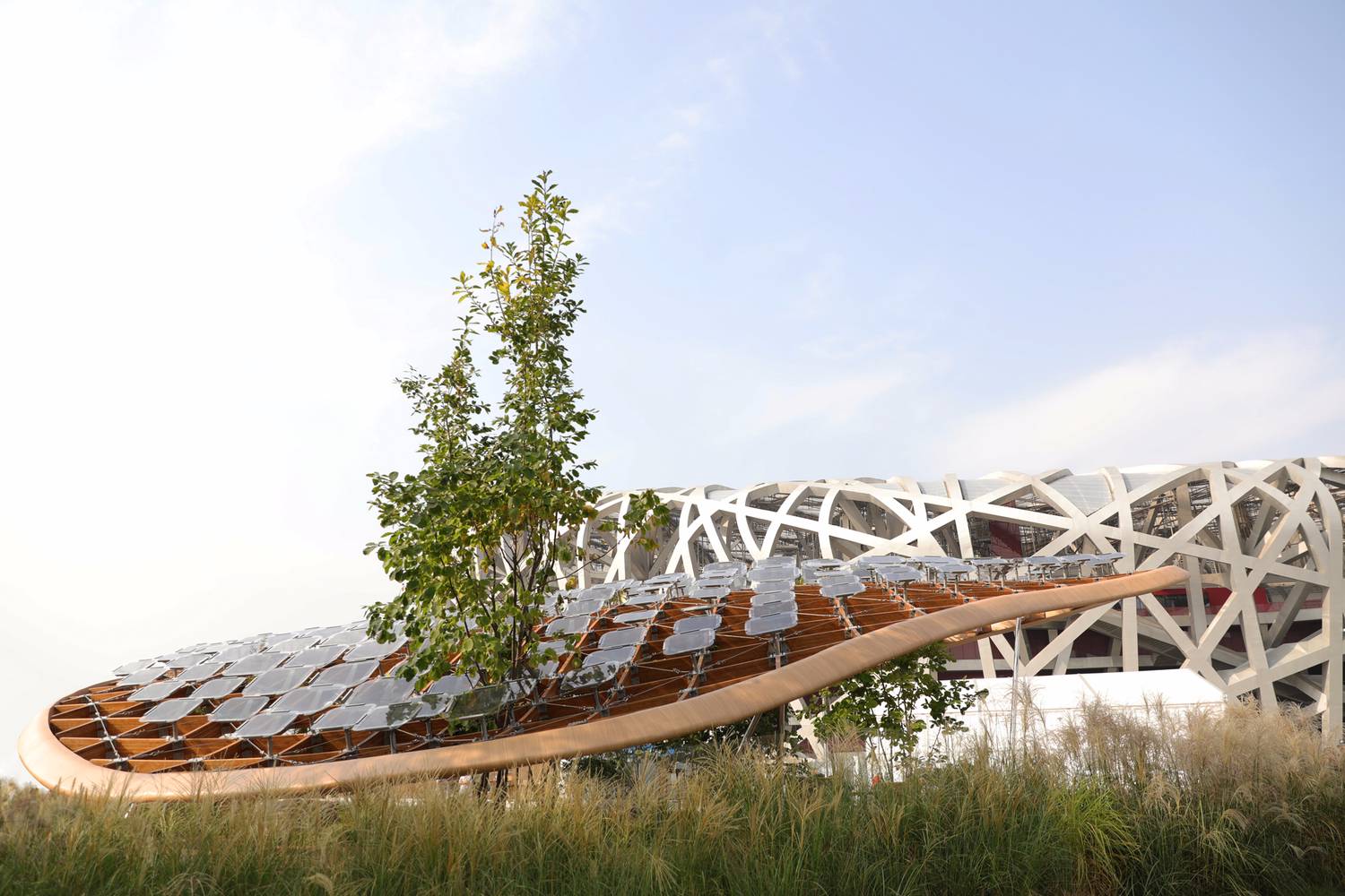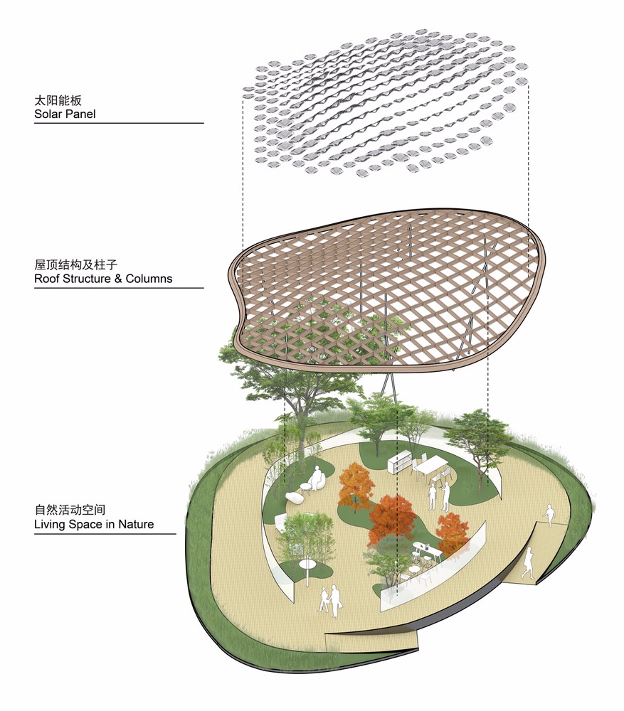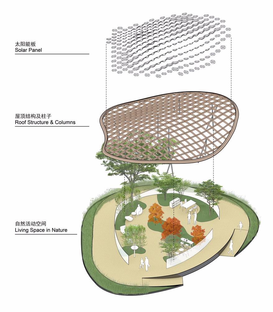 “庭園家”,是MAD對(duì)居住環(huán)境中人與自然、情感關(guān)聯(lián)的表達(dá)。這是一組介于建筑與景觀之間的想象力開放的作品。從遠(yuǎn)處看,建筑的主體“屋頂”像是飄在半空中的云,這片“云”實(shí)際是二百多塊由漢能研發(fā)的薄膜屋頂組件。板塊能夠隨著太陽(yáng)能光線調(diào)整傾斜角度,實(shí)現(xiàn)高效發(fā)電,每天生產(chǎn)的電能足夠三口之家平均日常消耗電量。陽(yáng)光同時(shí)透過透明薄膜,灑進(jìn)空間之內(nèi)。地面與“屋頂”之間的空檔是家的內(nèi)外空間,起居空間與景觀相互交替,伴著流動(dòng)的空氣、溫暖的陽(yáng)光、吹拂的微風(fēng),人的情感在環(huán)境的變換中得到滋潤(rùn)。