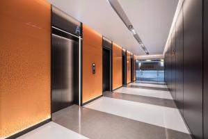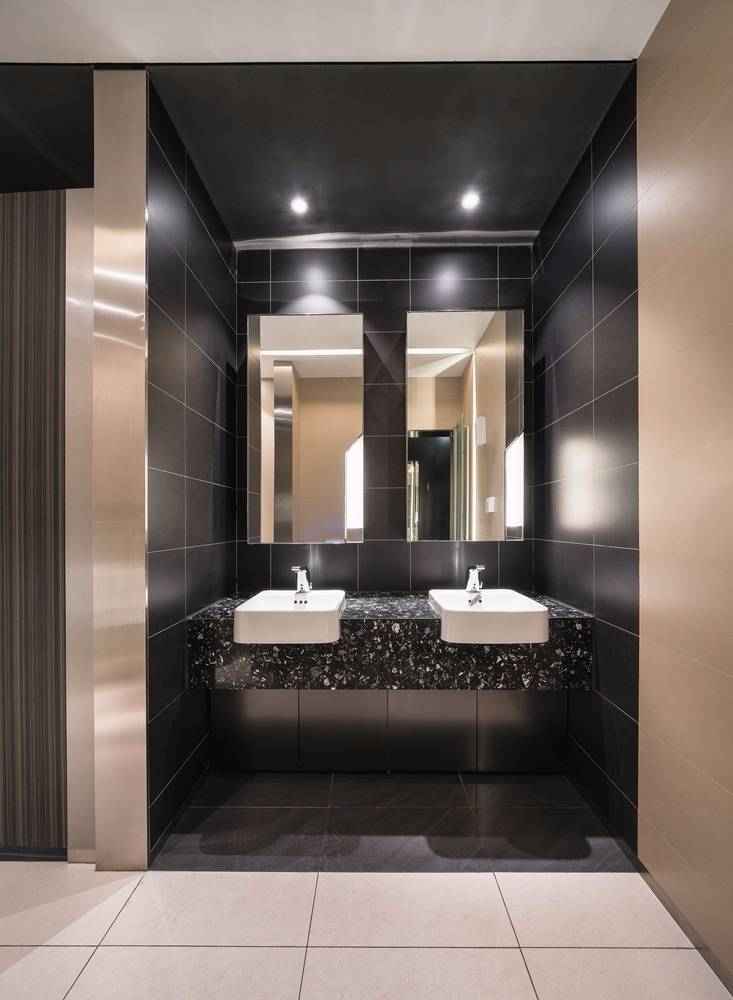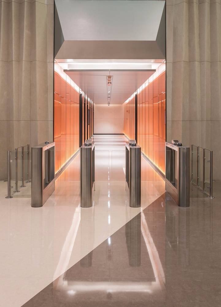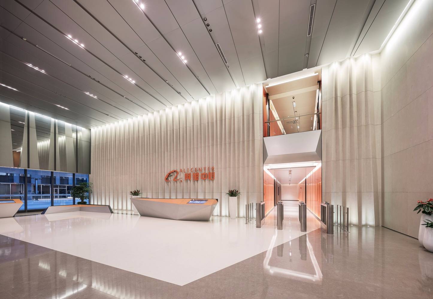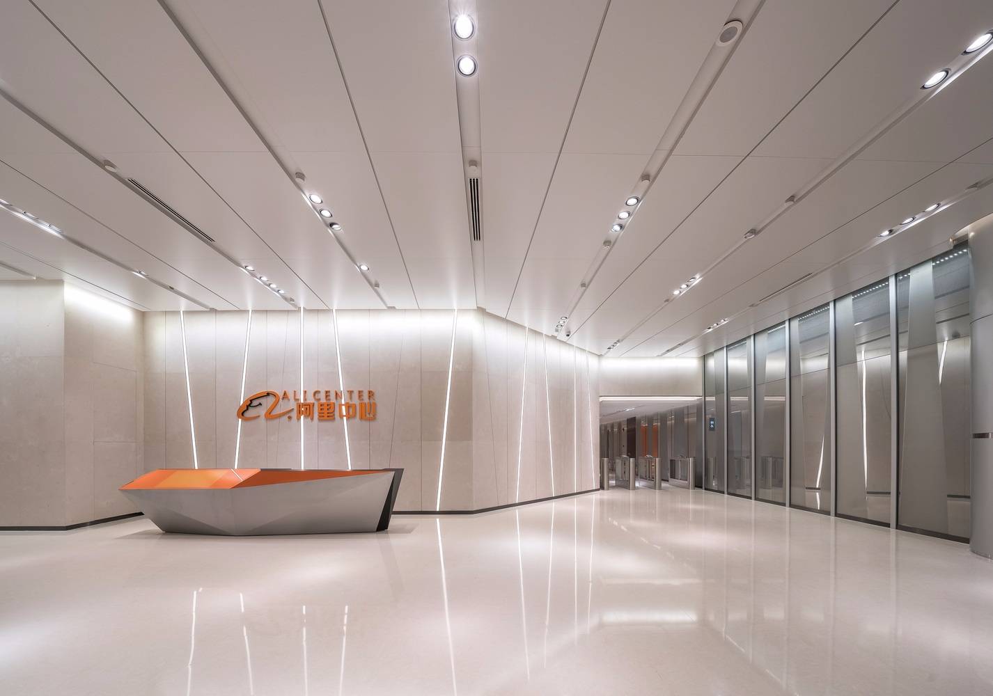 大堂的室內(nèi)設(shè)計遵循阿里巴巴提出的設(shè)計要求,考慮兩種不同的類型,即位于2、3號樓的主大堂和1、4號樓的次大堂,體現(xiàn)了整體風(fēng)格一致性及阿里巴巴品牌特征性的同時,在設(shè)計上利用“阿里橙”及墻面用材進行造型組合,區(qū)分了各自大堂空間的特色和標志性。橙色也大膽地運用在大堂前臺和信息臺以及電梯廳中,讓一到達阿里中心的訪客們和工作者第一時間感受到了企業(yè)文化的渲染力及歸屬感。一些私密空間設(shè)計上,比如衛(wèi)生間的處理上,大體塊面運用黑灰色大理石材質(zhì)及香檳金屬板,大氣又兼具現(xiàn)代感。