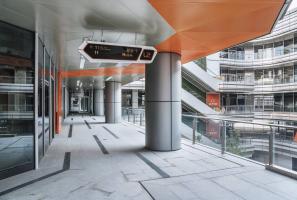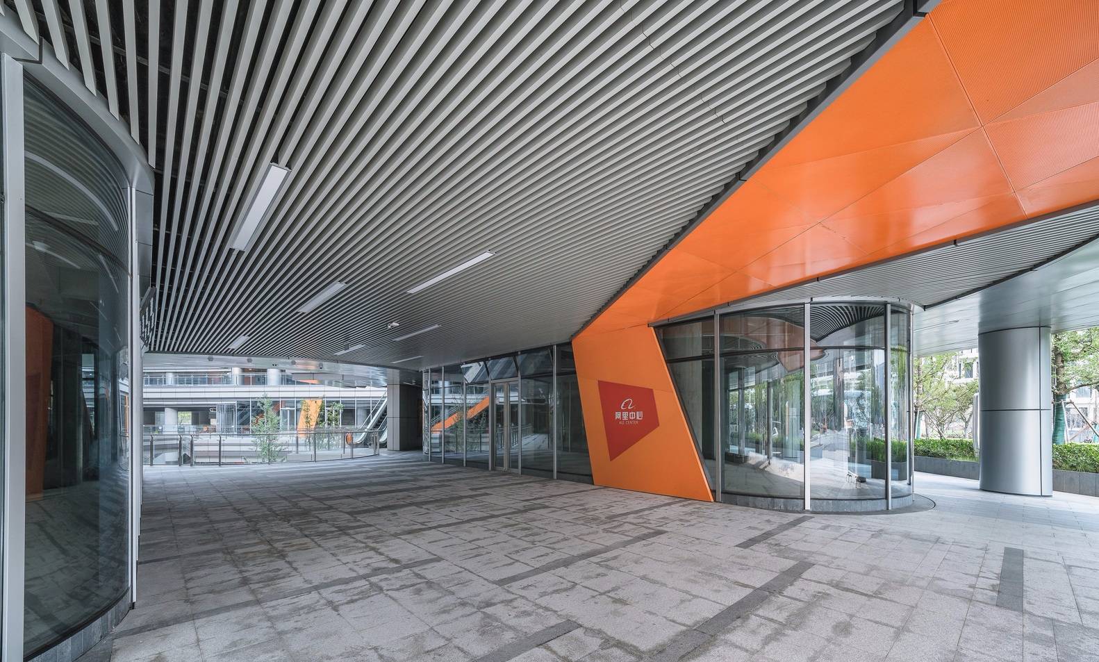 除了傳統(tǒng)的導(dǎo)視性標識,在每棟樓入口大堂玻璃幕墻上和室外結(jié)構(gòu)柱上令人矚目的大型樓宇號logo也是設(shè)計上的亮點。另一個不容錯過的是融合在室外空間設(shè)計中的標識設(shè)計,也以幾何拼接的“橙色紐帶”為概念,寓意著阿里巴巴的產(chǎn)品和科技如同紐帶一般連接著中小型企業(yè)與千家萬戶,在表現(xiàn)效果上從室內(nèi)延伸到室外空間,并將室外庭院在空間上從地下一層至地上四層在立面上進行串聯(lián),起到品牌一致性和視覺聯(lián)系性的同時,也為在這里工作的白領(lǐng)們創(chuàng)造了一個可以忙里偷閑的,自然生態(tài)又充滿活力的公共空間。