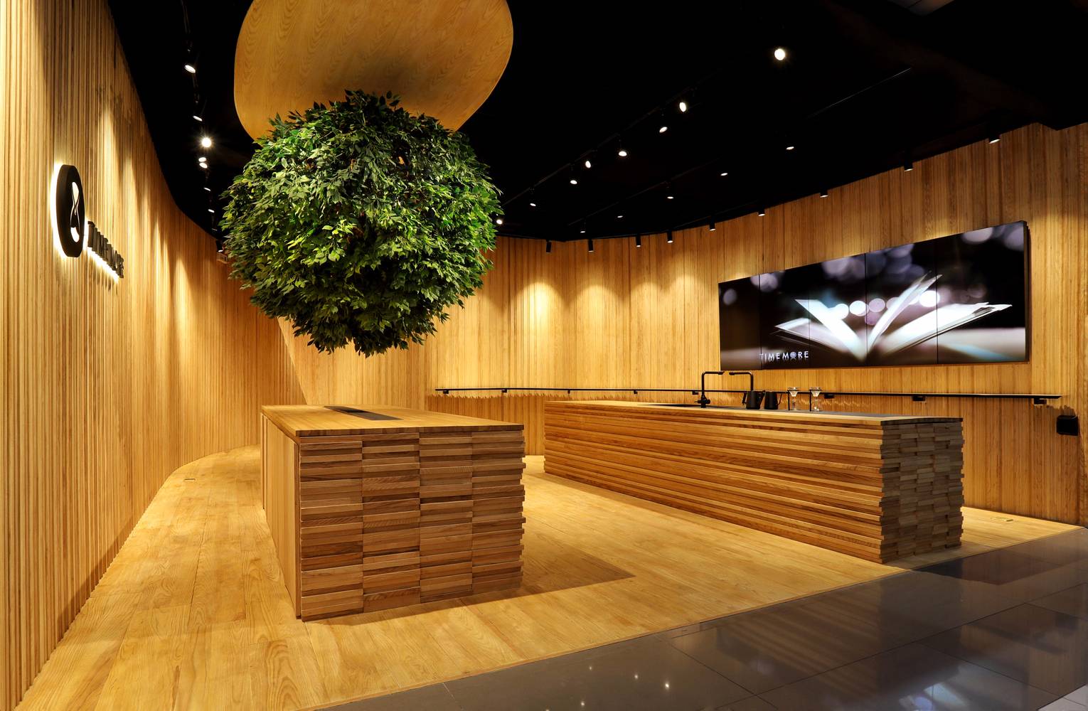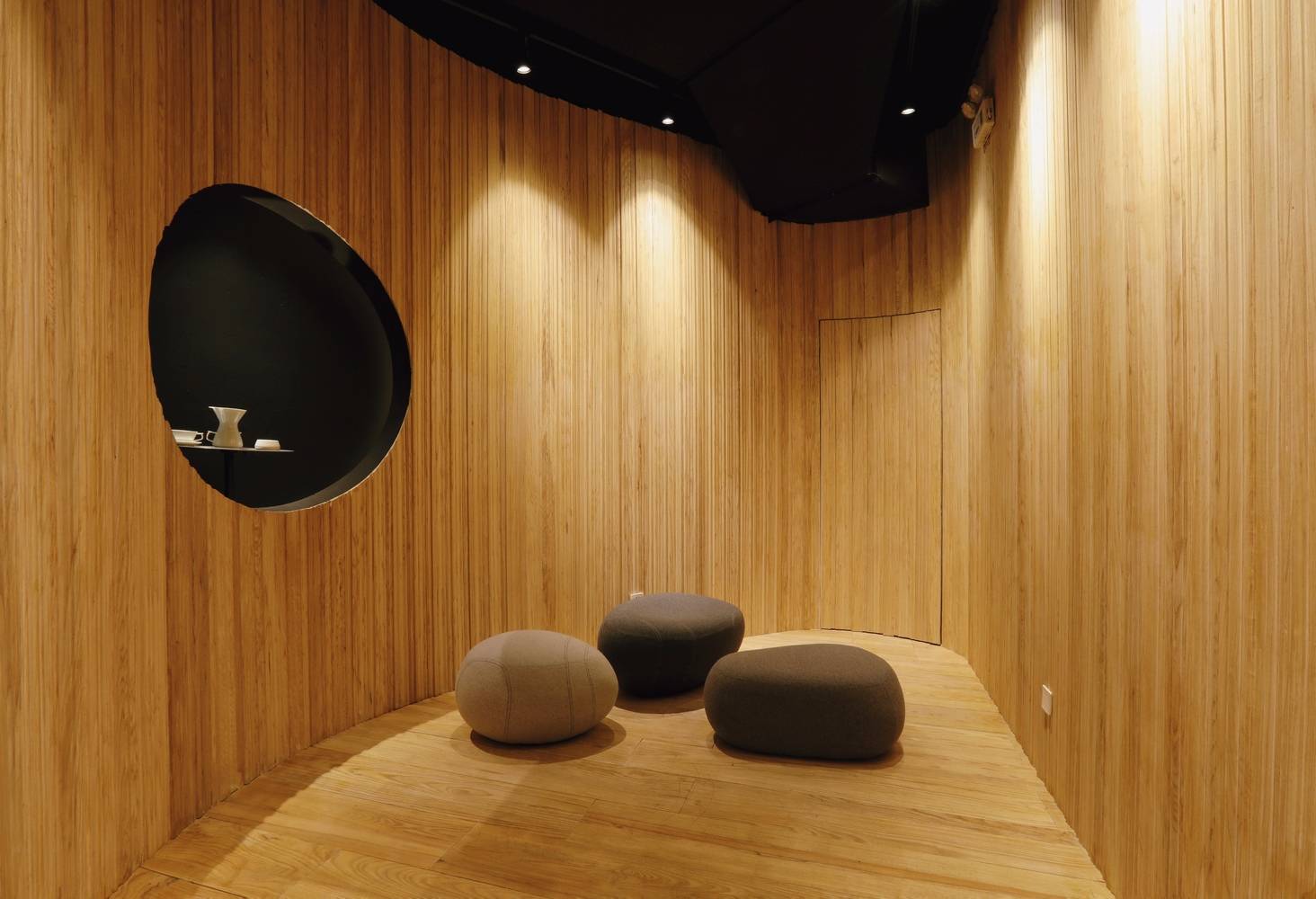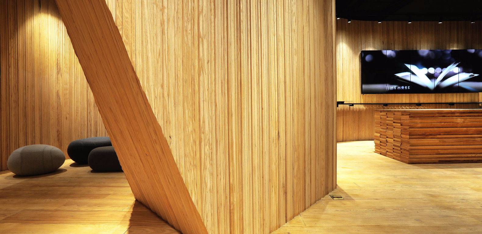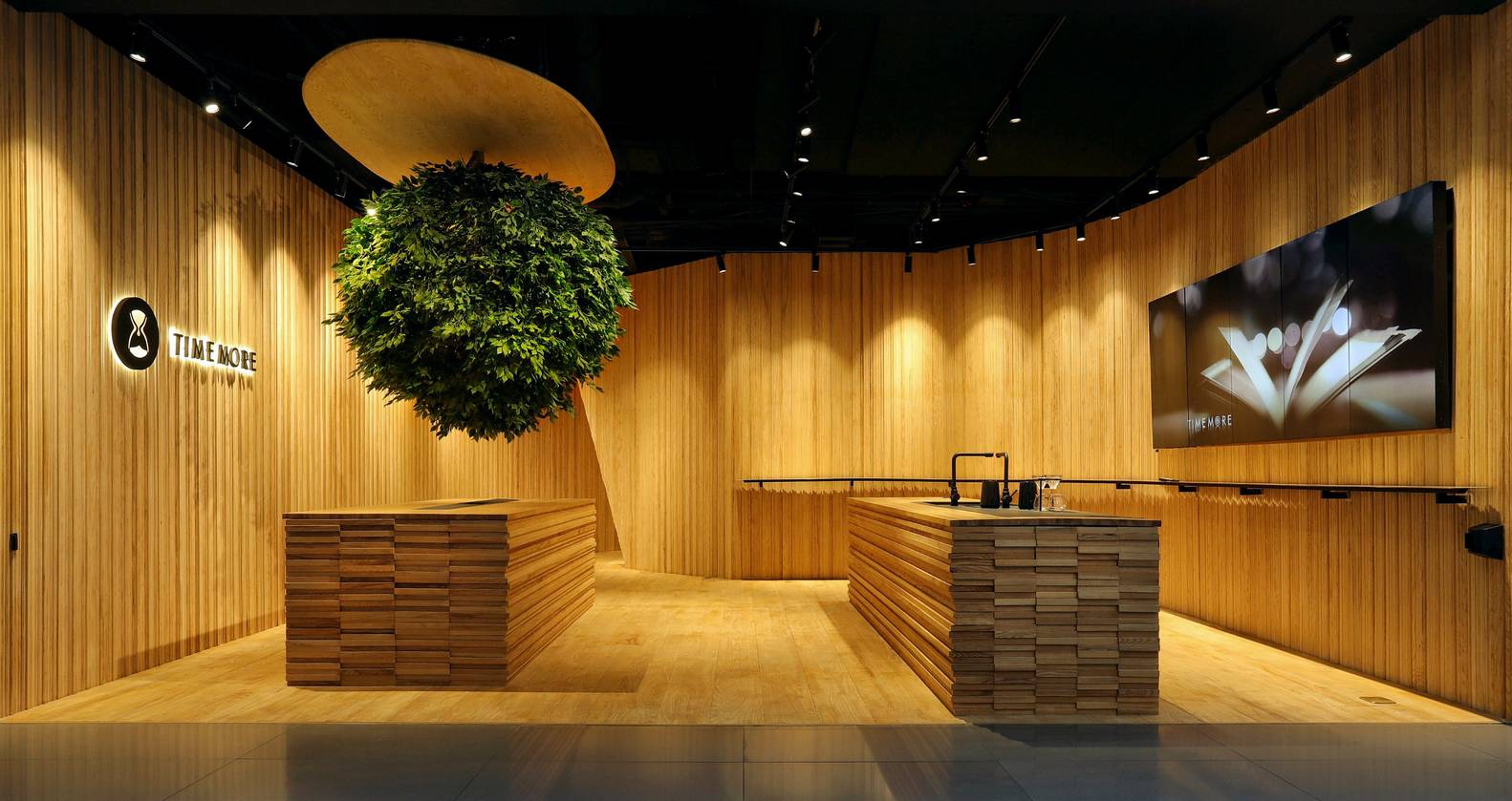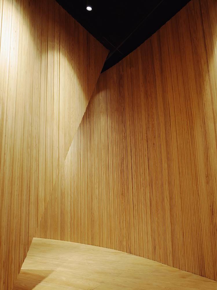我們把這家店理解成一個關(guān)于“時間”的世界??Х榷故怯猩?,一杯咖啡的制作,研磨、萃取及每一個步驟都需要耐心和專注。這里也是一個安靜的世界,時間在這里靜靜的流淌,這個世界的組成要素里主要是木頭,時間凝結(jié)成的生命。一道金屬弧形展架在右側(cè)墻面順勢劃過,空間始終以二元方式展開,動與靜、剛與柔、內(nèi)與外、正與反。這樣讓整個空間蘊含某種張力。