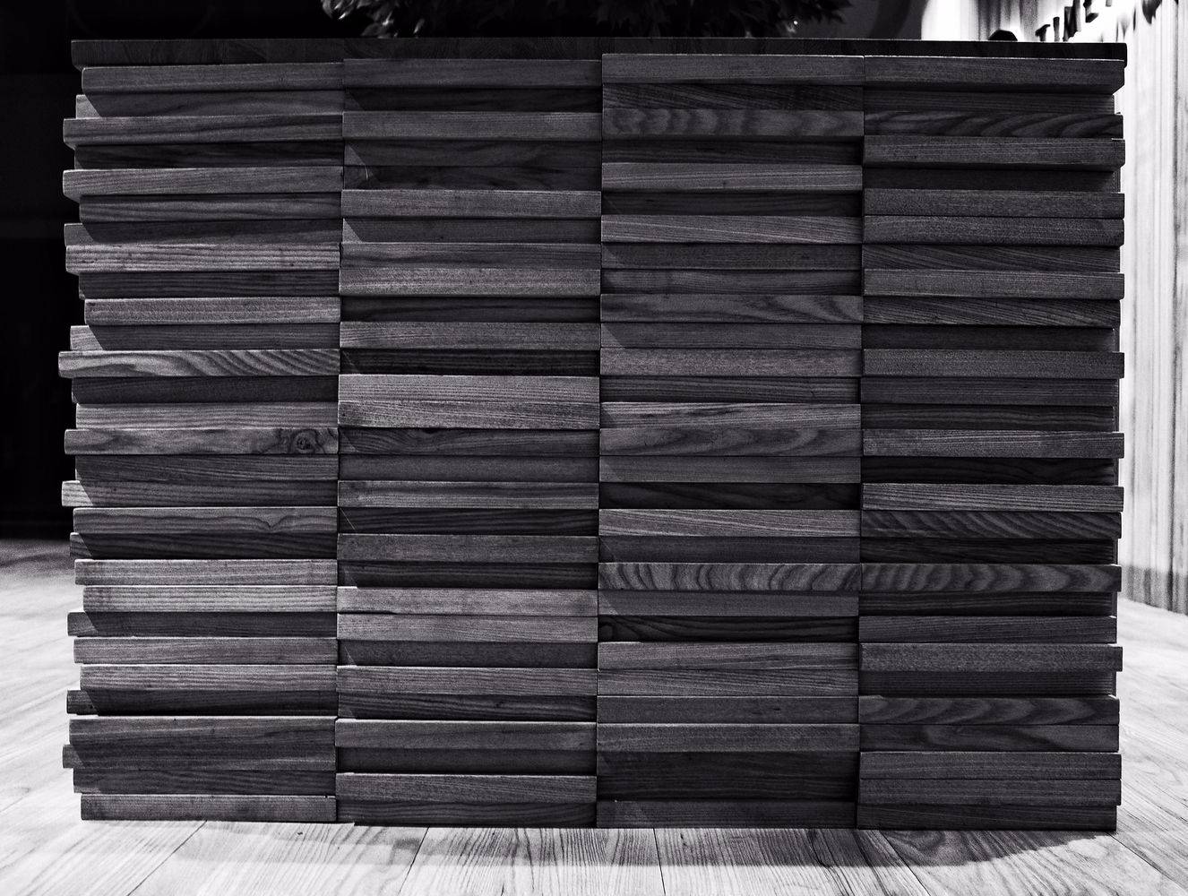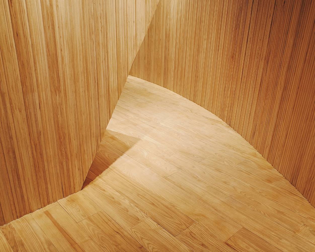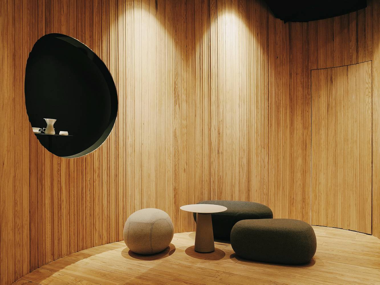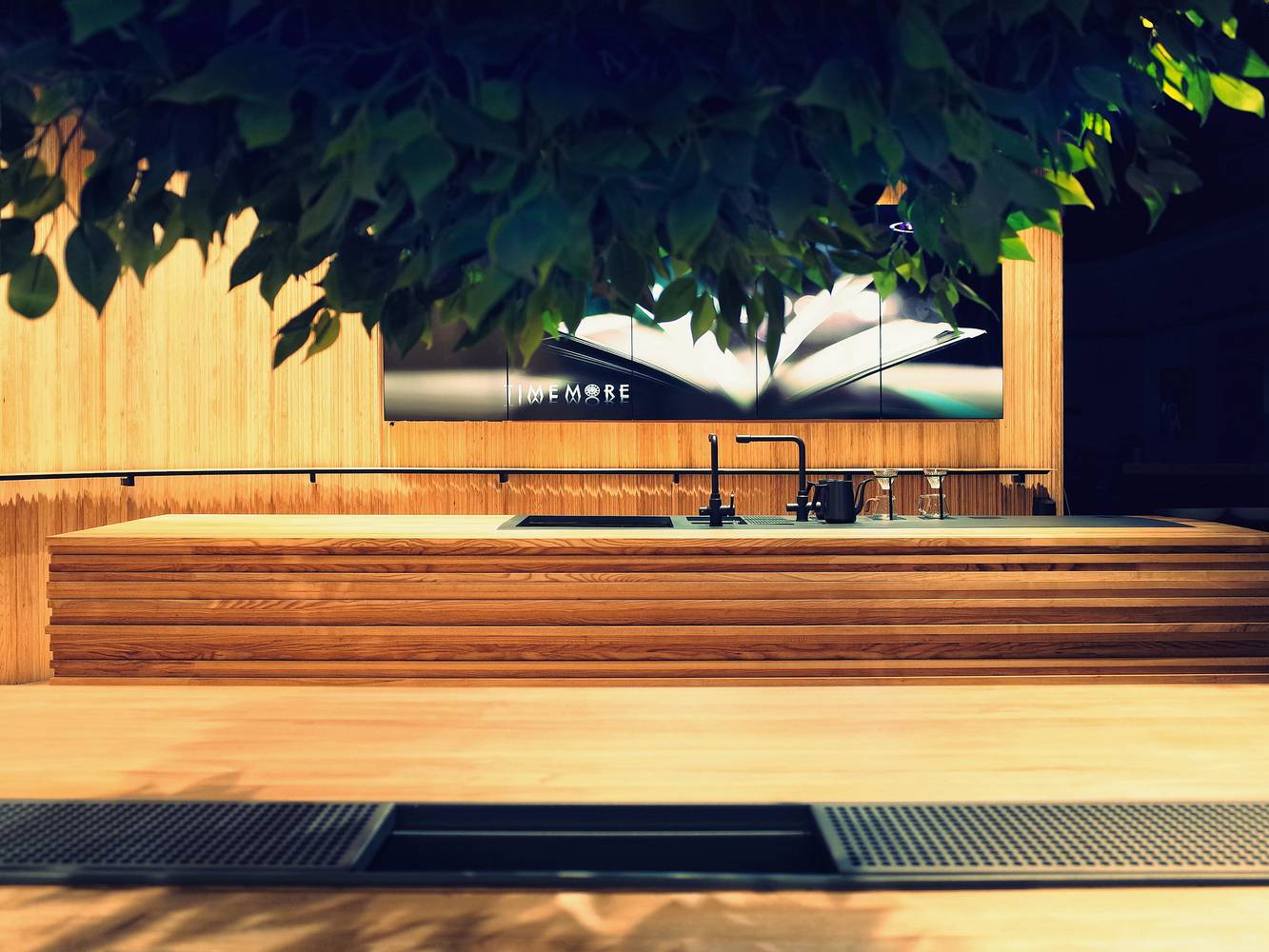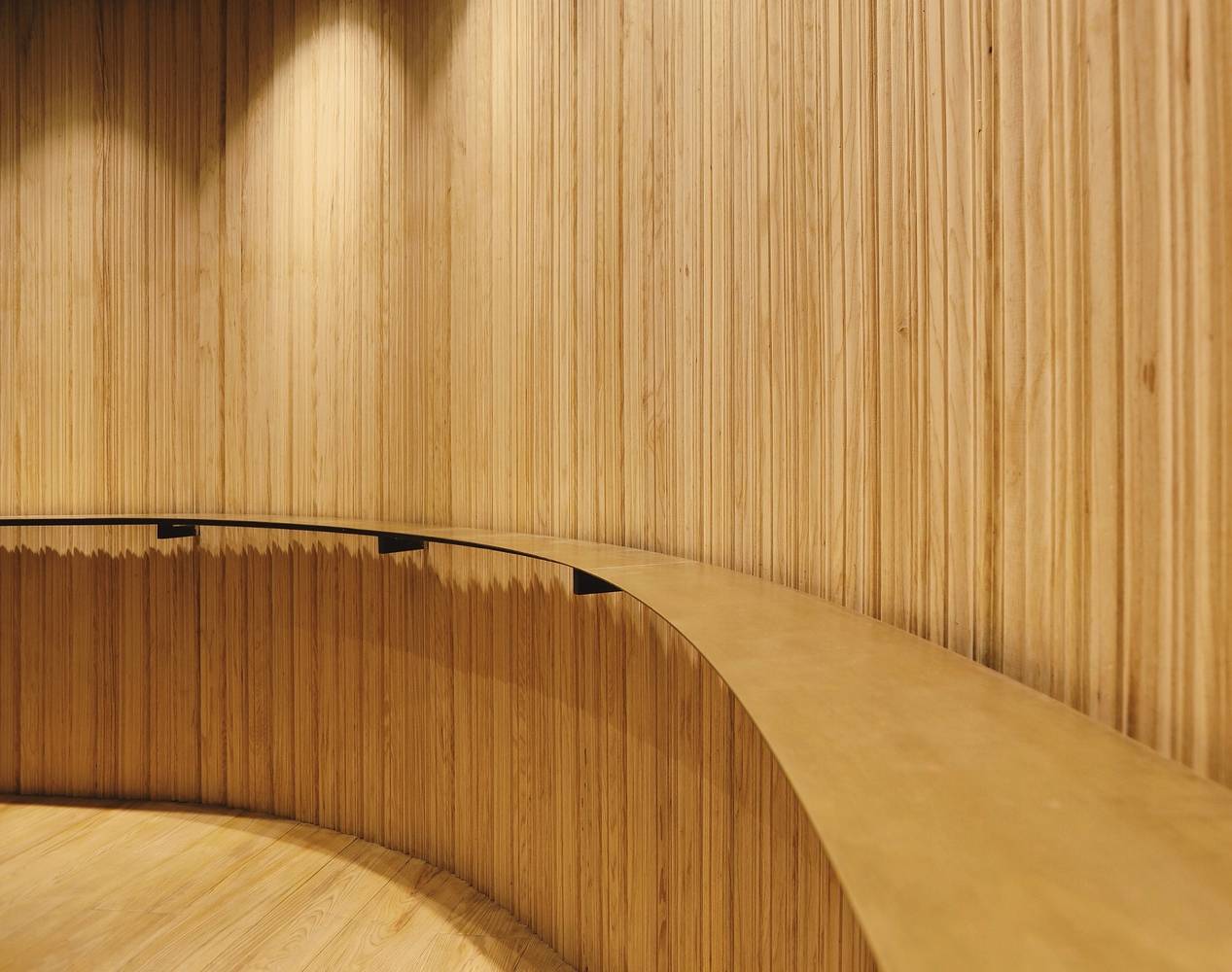 我們把這家店理解成一個關(guān)于“時間”的世界??Х榷故怯猩?,一杯咖啡的制作,研磨、萃取及每一個步驟都需要耐心和專注。這里也是一個安靜的世界,時間在這里靜靜的流淌,這個世界的組成要素里主要是木頭,時間凝結(jié)成的生命。一道金屬弧形展架在右側(cè)墻面順勢劃過,空間始終以二元方式展開,動與靜、剛與柔、內(nèi)與外、正與反。這樣讓整個空間蘊含某種張力。