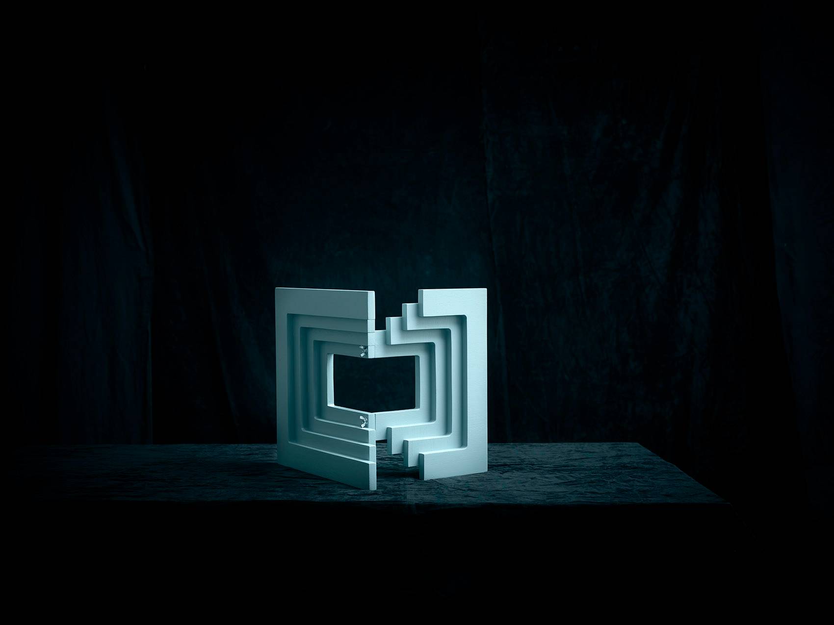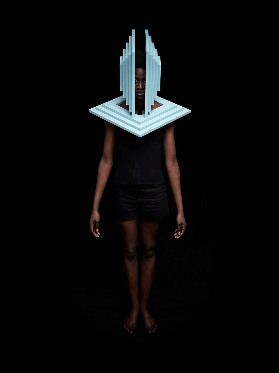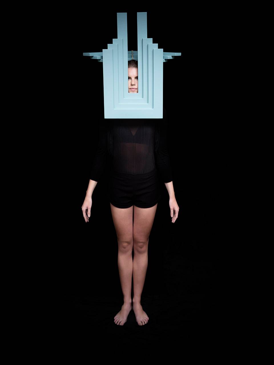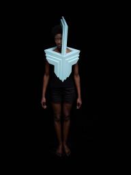 通過數(shù)字形象表現(xiàn)自我文化身份是一個(gè)相對(duì)比較新鮮的現(xiàn)象,人們挑選自己的數(shù)字肖像,試圖在自我表達(dá)和群體認(rèn)同中找到平衡。在這九個(gè)面具中,Siba展示了圖像與現(xiàn)實(shí),公眾與個(gè)人之間不斷轉(zhuǎn)換的關(guān)系。她的面具質(zhì)問道:“在數(shù)字時(shí)代,人究竟為何物?”面具富有建筑感的開放結(jié)構(gòu)讓“臉”與立面產(chǎn)生交錯(cuò)。這些面具為淺藍(lán)色,高60厘米,由18毫米厚的木板制成。每個(gè)面具包含11個(gè)層層相疊的元素,均為CNC加工而成。