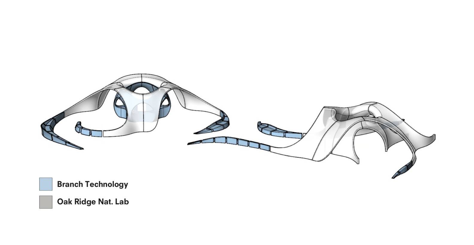 SHoP 發(fā)揚(yáng)這些限制, 確定展館的形式、尺寸和結(jié)構(gòu)跨度,以便每個(gè)展館都需要兩個(gè)機(jī)器人的協(xié)作。 仔細(xì)觀察完成的展館本身,對(duì)自然和機(jī)器決定的形式的沉思,甚至可能揭示這些怪異的擬人化工業(yè)工具的“手”,這些工具注定要在形成我們共同的人類環(huán)境中發(fā)揮越來越大的作用。