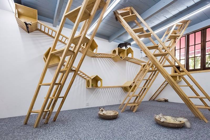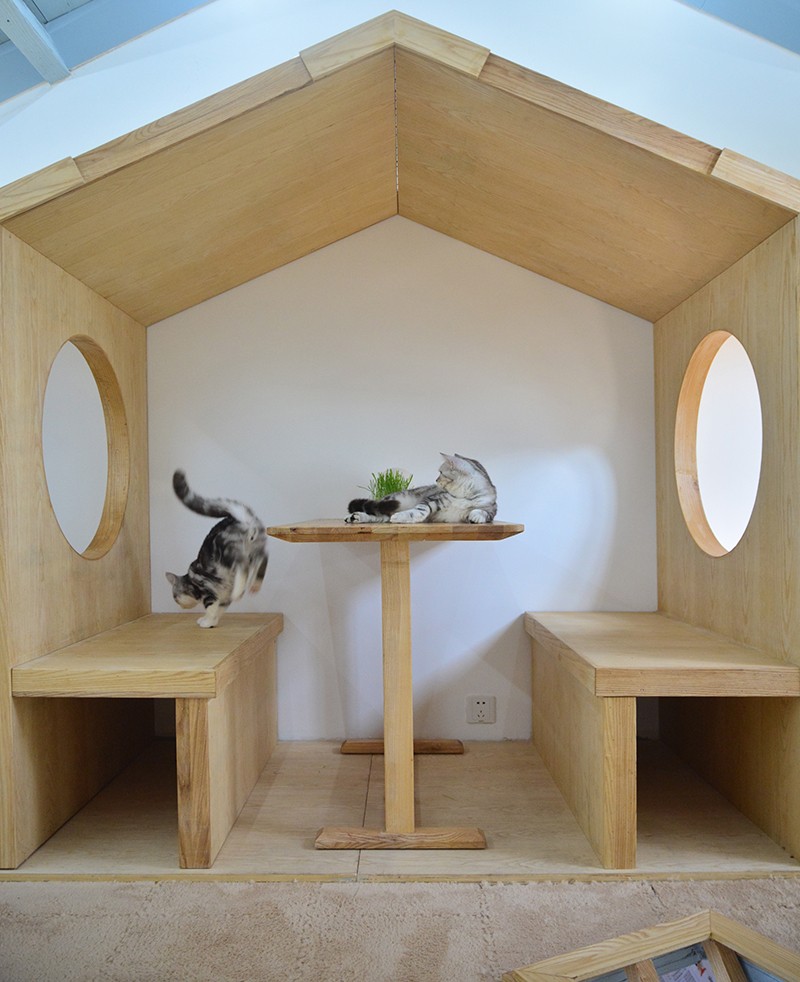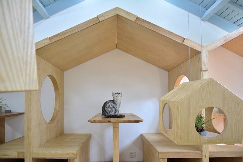 在三層休息區(qū)設(shè)置屋形固定座位,供客人們更加舒適的擼貓。同時(shí)在座位之間設(shè)置圓形洞口,保證主子們的來去自如。