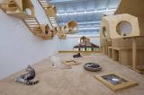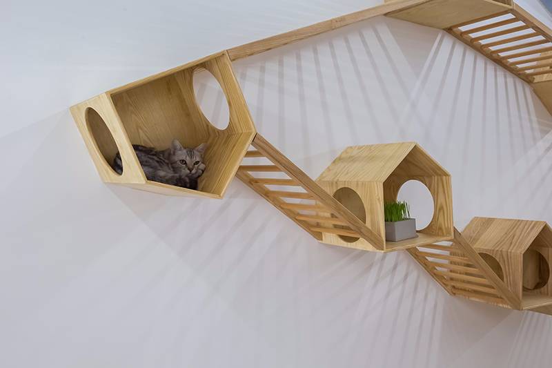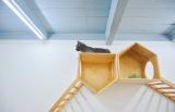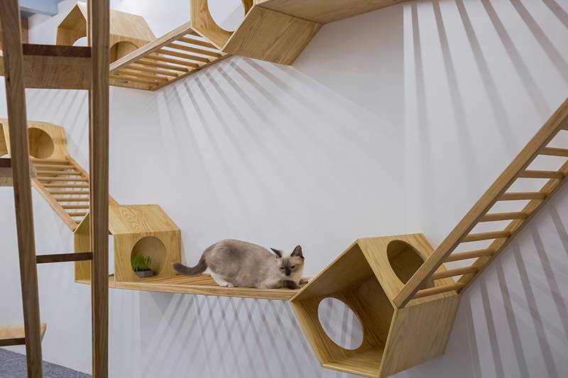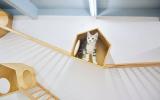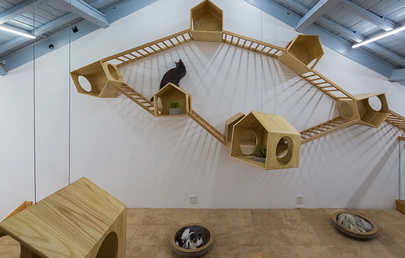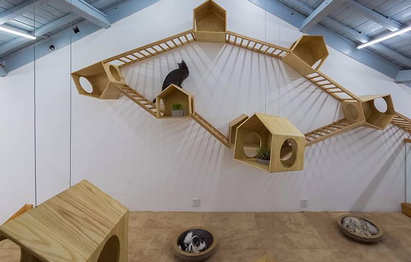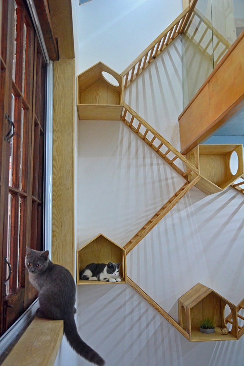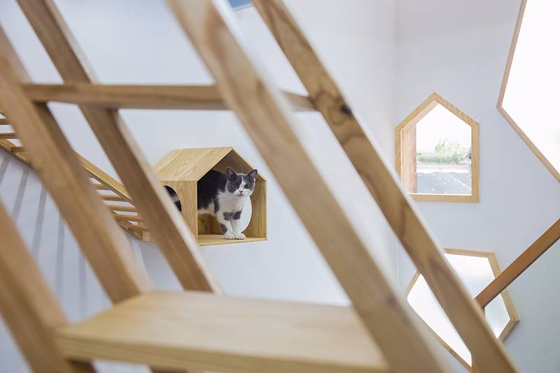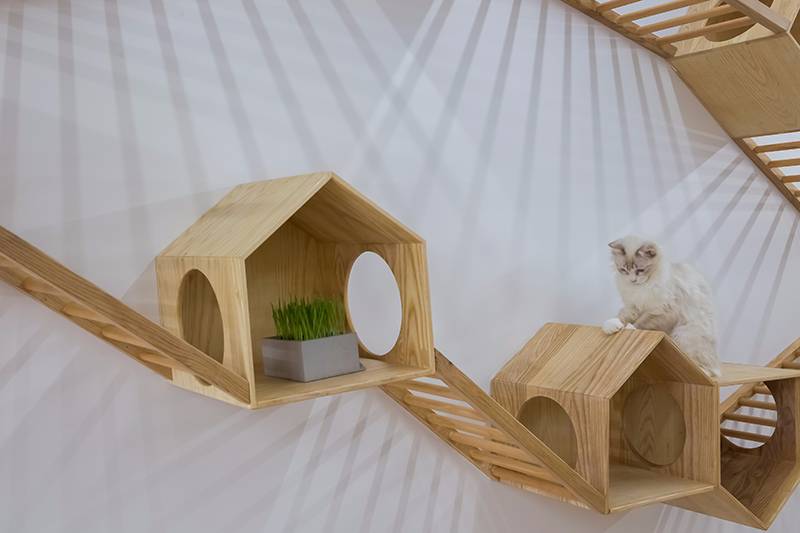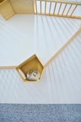 屋形的貓窩通過開洞和貓爬架相互串聯(lián),在墻面上形成一整片活動(dòng)區(qū),使得貓咪們可以自由玩耍探索。貓爬架形成的特殊光影,也為貓咪們提供了新的趣味。