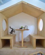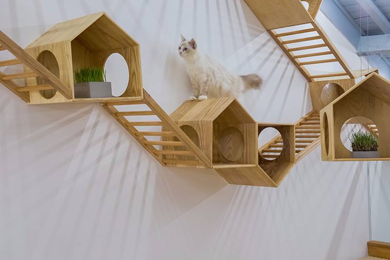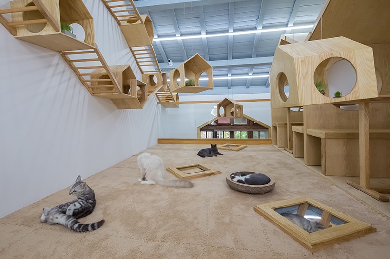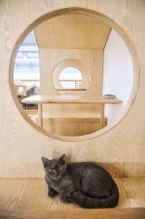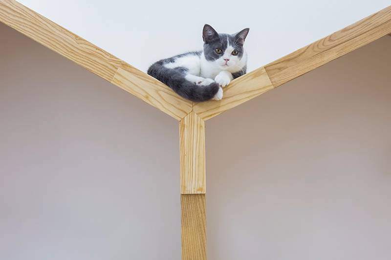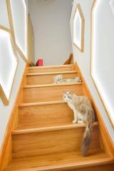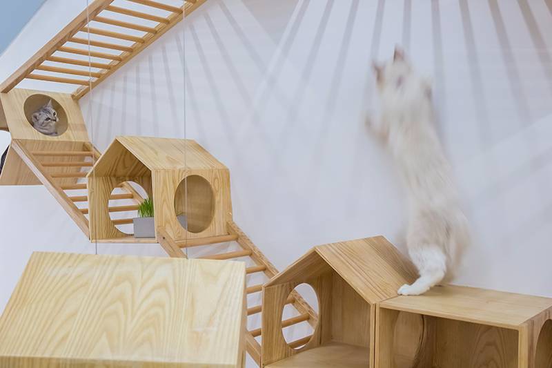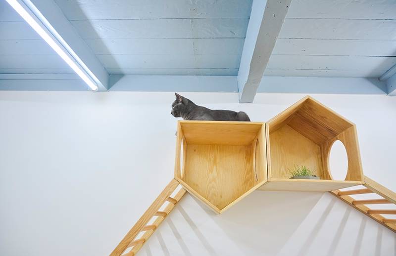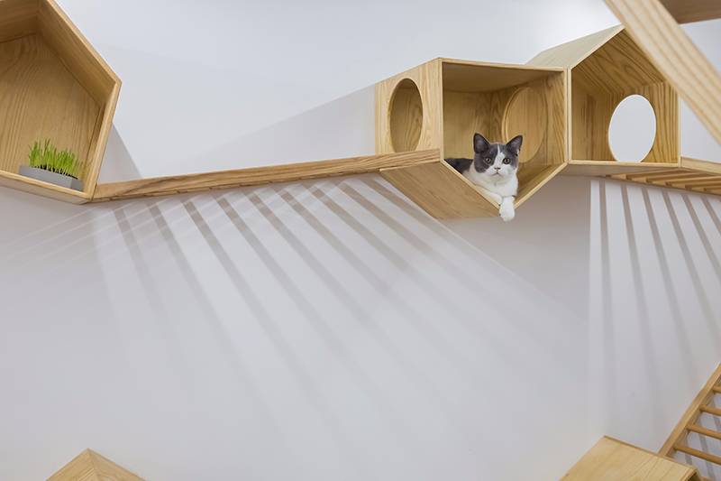從入口的門框到墻壁的燈飾到貓咪的爬架和貓窩,考慮到耐久性能,使用白蠟?zāi)咀鳛榻y(tǒng)一的室內(nèi)裝飾材料。
