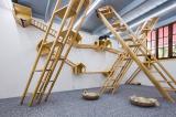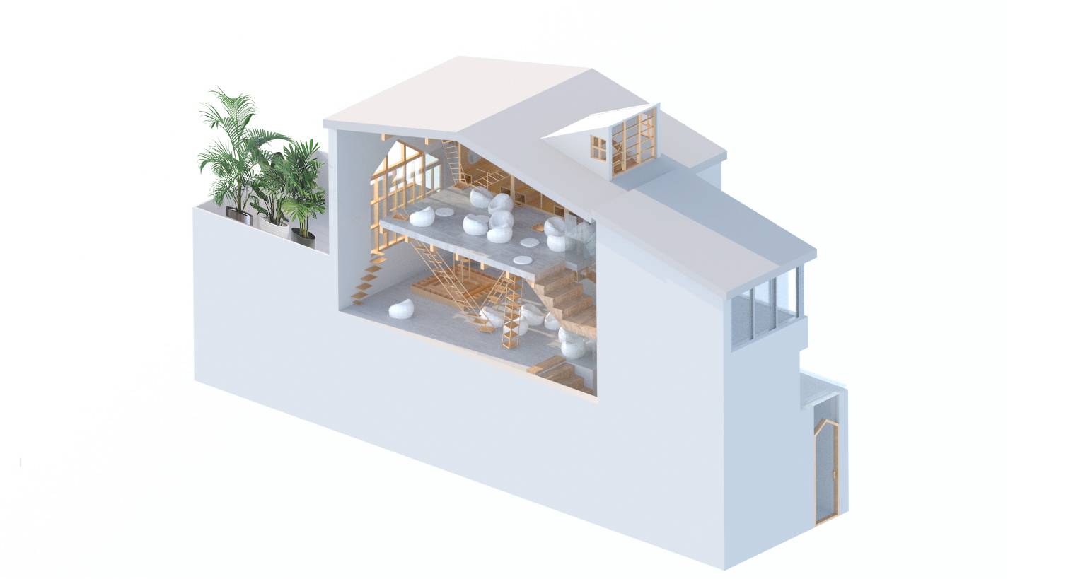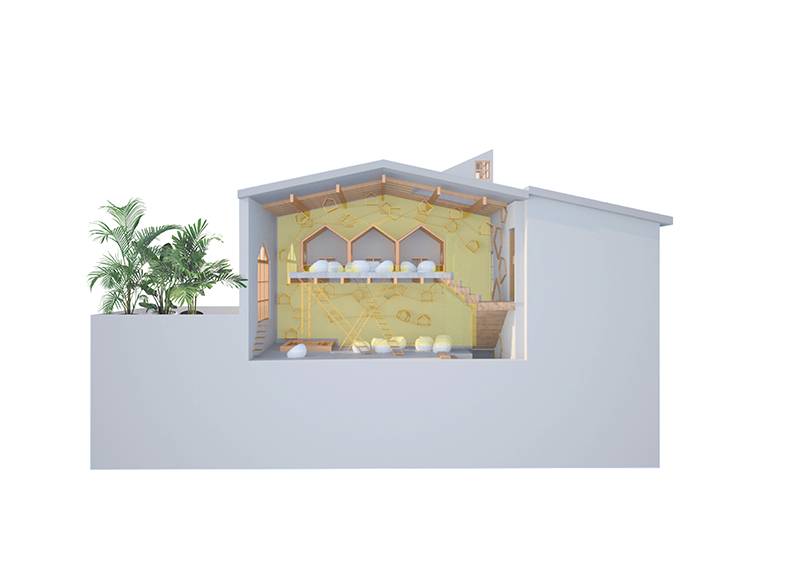 由于二層通向三層的貓爬架在三層的地面上造就了三個(gè)較大的洞口,會(huì)對(duì)客人的生命安全產(chǎn)生威脅,在現(xiàn)場(chǎng)設(shè)計(jì)中,采用漂浮的屋形盒子,阻隔在人行流線的半身處,在視覺上提醒客人下面有驚喜的同時(shí),保證了客人的人身安全。
