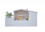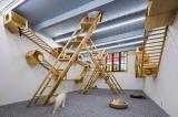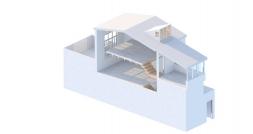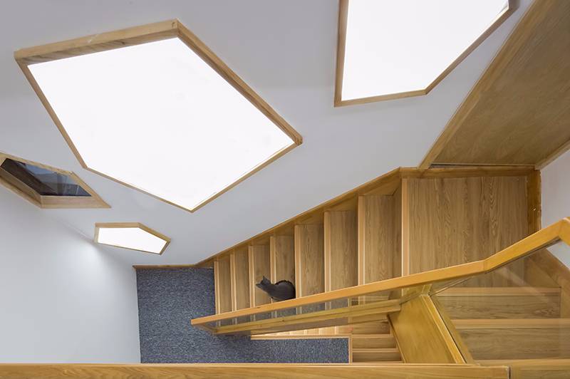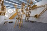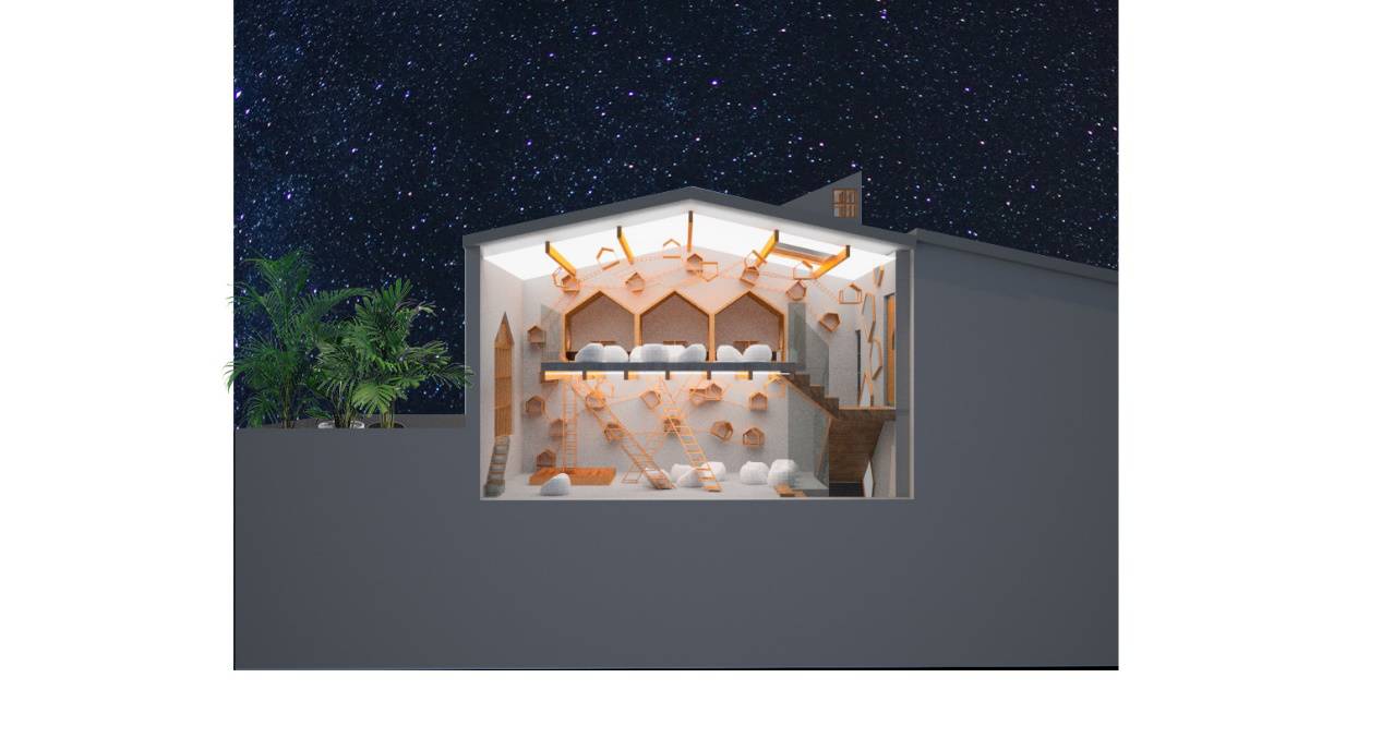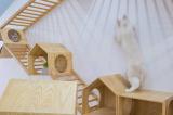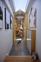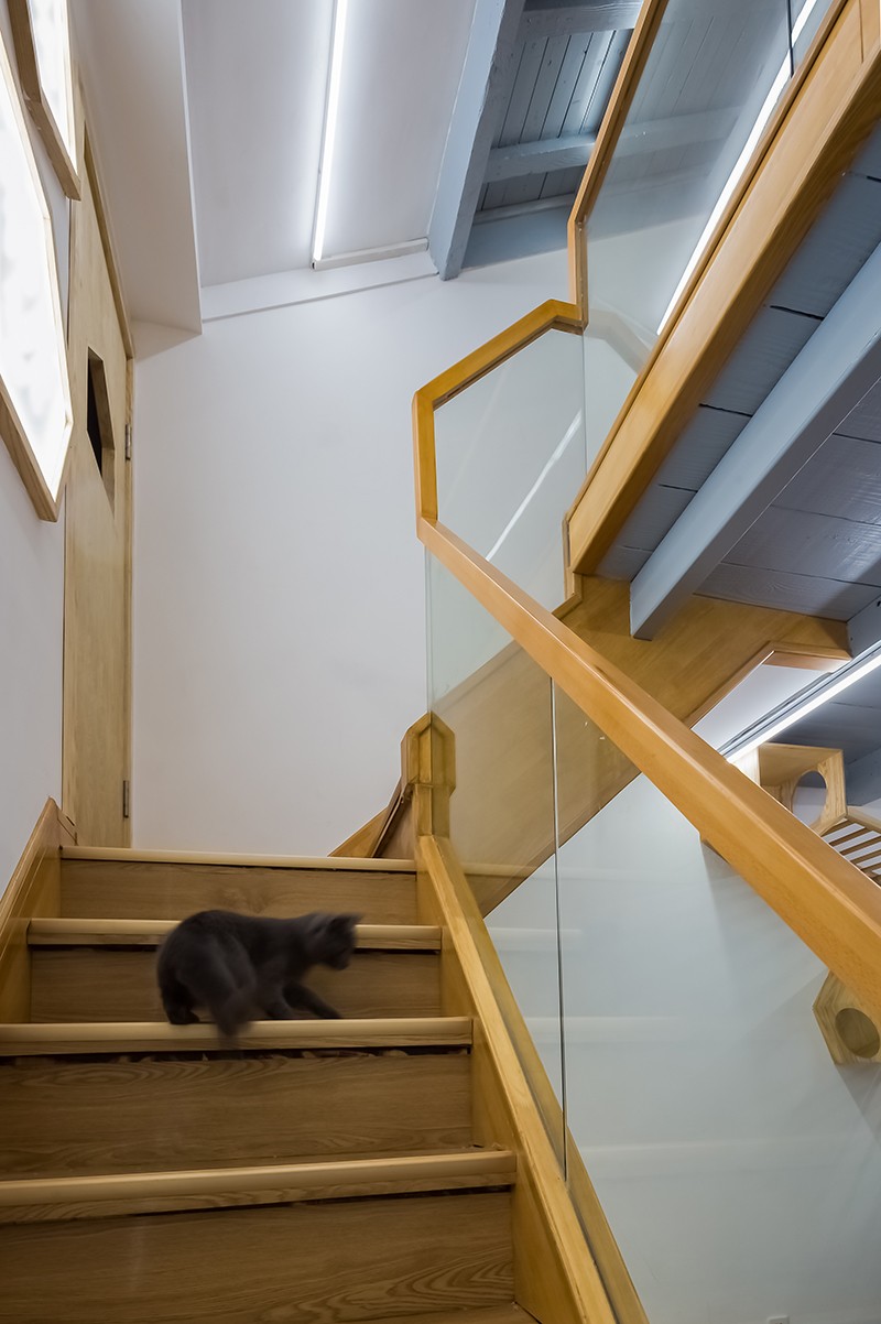 改造后,在二層和三層之間置入四個(gè)爬梯,其中一個(gè)為環(huán)形喂食架,方便貓咪從二樓空間直接爬向三樓。后因?yàn)榭臻g效果,取消了環(huán)形喂食架,整個(gè)二層空間有三個(gè)貓爬架作為貓咪登高到三層,從地面露出腦袋的快速通道。同時(shí)在墻面設(shè)置大量的貓窩和貓爬架,供貓咪嬉戲玩耍。將原始的方形大窗也修改成屋形,保持室內(nèi)完整的貓屋形象。