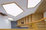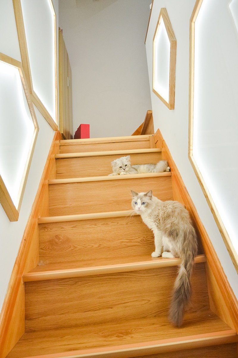 鏟屎官們上樓的場(chǎng)所也毫不意外的成為了貓主子們玩耍的地盤,在墻面上采用貓窩的形象,塑造大面積的光源。同時(shí)對(duì)原有的玻璃窗進(jìn)行改造,創(chuàng)造一個(gè)形制一致的墻面效果