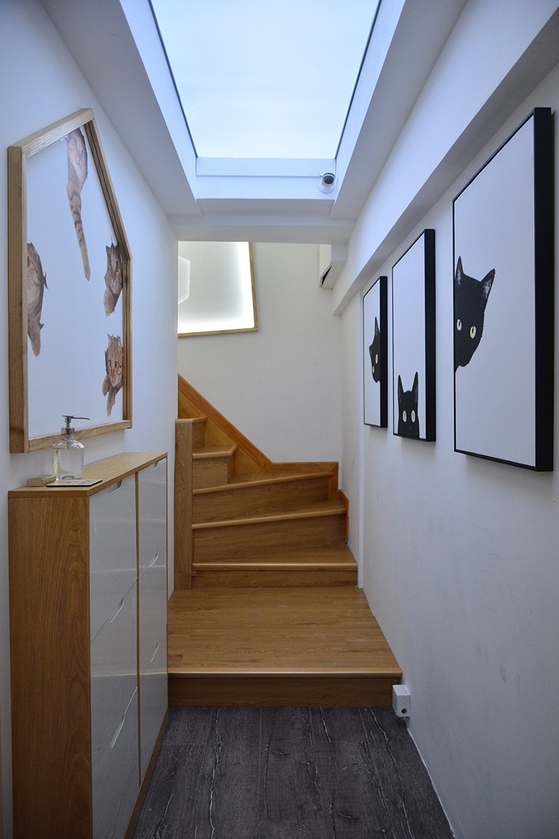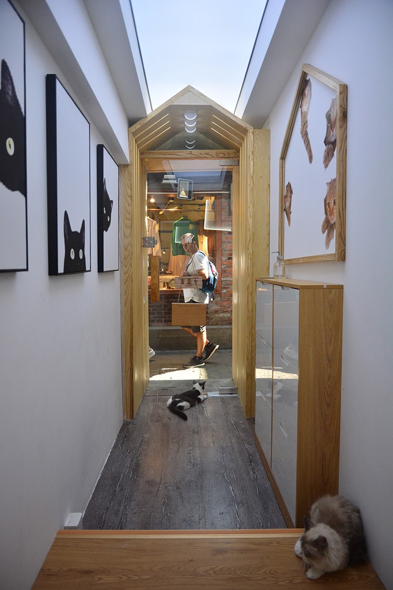 調(diào)整了原始陡峭的踏步,增加臺(tái)階,保證鏟屎官們體驗(yàn)的安全性。在入口區(qū)設(shè)置免洗洗手液及拖鞋,保證鏟屎官們?cè)谶M(jìn)入擼貓館之前病菌被消滅。同時(shí)設(shè)置墻壁上的畫作作為游客自拍點(diǎn)。