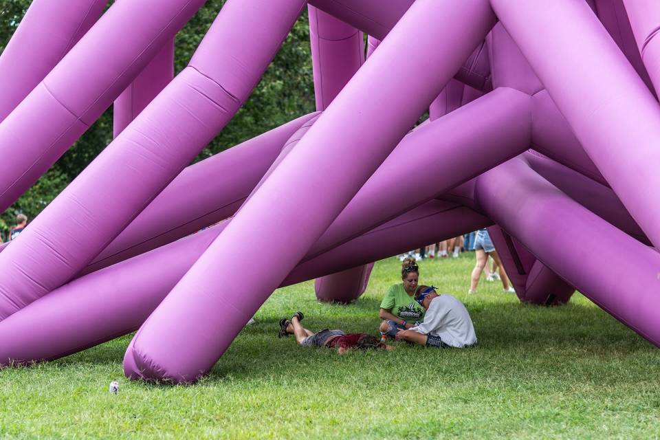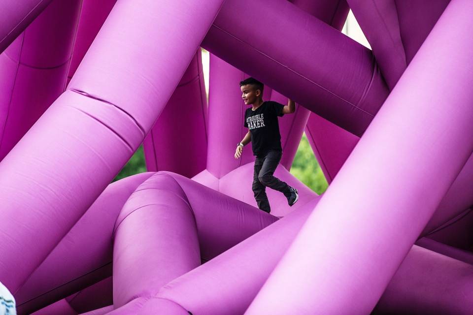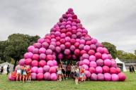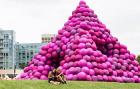 球體金字塔由數(shù)百個(gè)大小相同的充氣氣球堆疊而成,塔面上還有三個(gè)圓形的“門洞”。一系列球體最終構(gòu)成了一個(gè)角錐體結(jié)構(gòu)。貫穿金字塔中心的隧道使人們可以直接看到金字塔內(nèi)部,從而使金字塔變得“透明”。這是一種關(guān)乎于物質(zhì)與形式的體驗(yàn)。