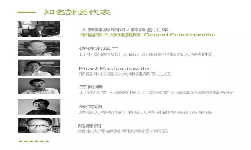 大師云集:本次大賽設(shè)置了“規(guī)劃+景觀組、建筑+室內(nèi)組、彩繪+藝術(shù)組”三個組別,史無前例地集結(jié)27位國內(nèi)外知名專家,包括:泰國著名建筑師Ongard Satrabhandhu、日本景觀設(shè)計大師佐佐木葉二、泰國朱拉隆功大學(xué)建筑系主任Pirast Pacharaswate、北京林業(yè)大學(xué)園林學(xué)院副院長及教授王向榮、清華大學(xué)景觀學(xué)系副系主任朱育帆教授、湖南大學(xué)建筑學(xué)院教授及院長魏春雨等。國際大師同臺亮相,將對最終三十強(qiáng)的作品進(jìn)行評審,三強(qiáng)勝出者更可獲得與大師們親密對話的機(jī)會。