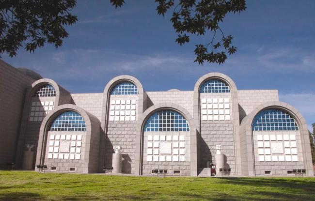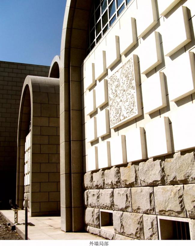 博物館主體(一至三層)為上小下大的覆斗形,給人以山體的聯(lián)想,外牆以粗獷的花崗巖石板為主,橫向以水平的采光窗幕墻強調(diào)了巖層的感覺,正面3層高的龕式門洞正是山洞的形狀,洞口結(jié)晶立方體的蜂窩狀裝修,是對伊斯蘭建筑中“依旺”入口上“??思{斯”的隱喻。