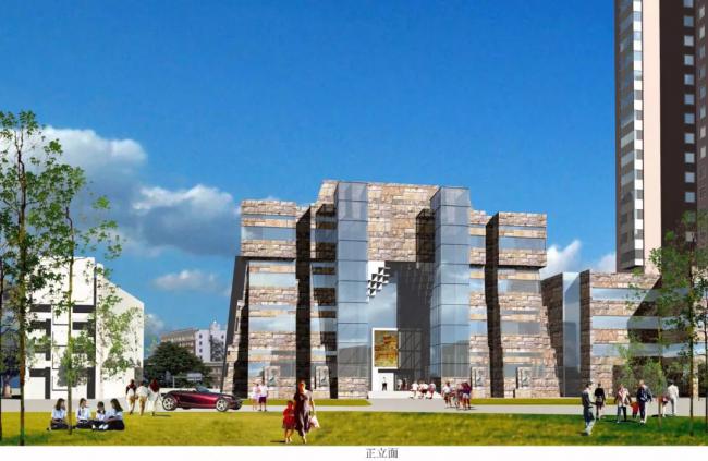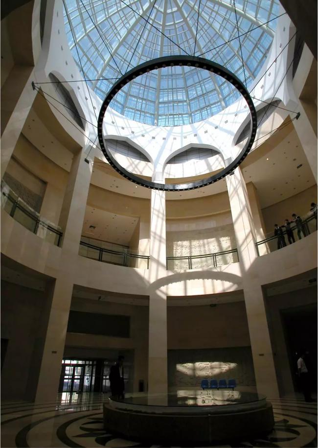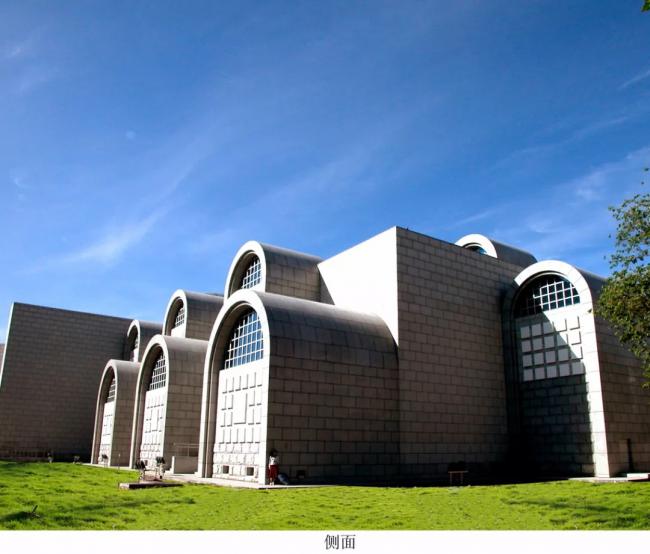 為了強調(diào)新疆特殊的區(qū)位,正面弧形玻璃幕墻隱喻為歷史的一面鏡子,并在正面設(shè)計了6個代表古希臘、古羅馬、古印度、古波斯,以及中國斗拱、維吾爾的大理石制作的典型柱式,以強調(diào)中國中原、兩河、印度、地中海文明在新疆的交匯。