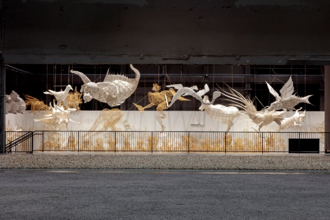 在洛杉磯marciano藝術(shù)基金會(huì)的竹船上空,懸掛著艾未未用竹子和絲綢制成的人物形象。這些人物的靈感來(lái)自于《山海經(jīng)》中的神話(huà)人物,這本書(shū)的歷史可以追溯到公元前4世紀(jì),艾未未2015年就開(kāi)始創(chuàng)作這些人物了。它們的創(chuàng)作地點(diǎn)是濰坊,濰坊因風(fēng)箏而聞名,它的風(fēng)箏制作史可以追溯到明朝(1368-1644)。