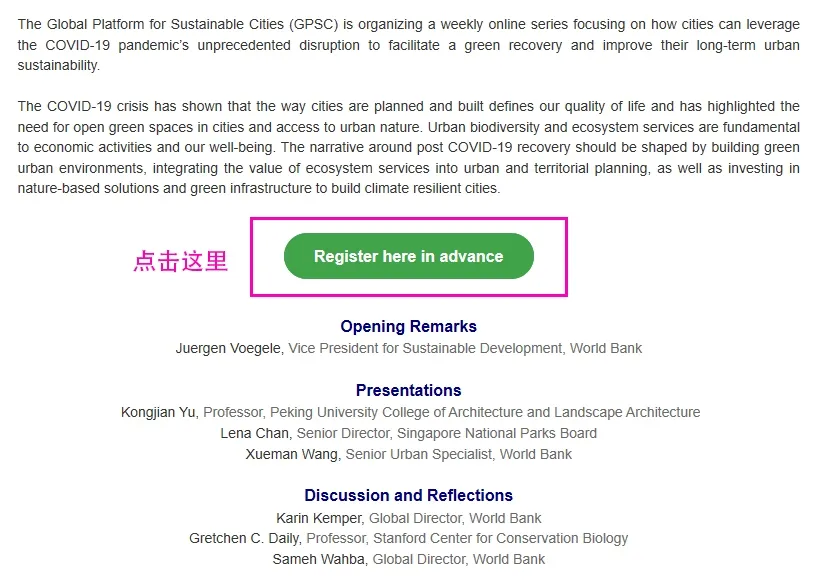 COVID-19發(fā)生后我們應(yīng)該如何將自然帶入城市,這次在線研討會將圍繞建立綠色的城市環(huán)境,將生態(tài)系統(tǒng)服務(wù)的價(jià)值納入到城市規(guī)劃中,投資基于自然的解決方案和綠色基礎(chǔ)設(shè)施,塑造一個(gè)能適應(yīng)氣候變化的城市等話題展開。