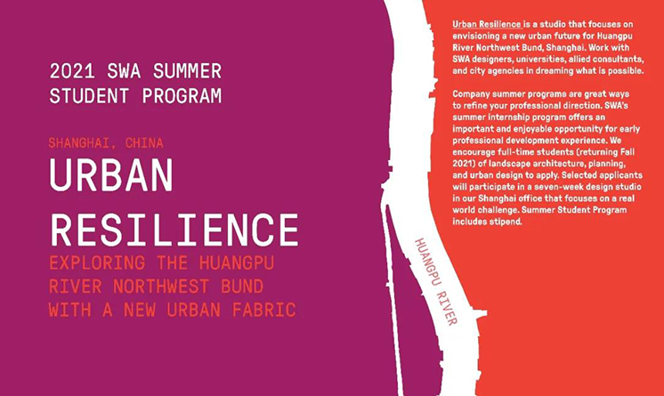 Urban Resilience is a studio that focuses on envisioning a new urban future for Huangpu River Northwest Bund, Shanghai. Work with SWA designers, universities, allied consultants, and city agencies in imagining what is possible for this unique place. SWA’s summer internship program offers a significant and enjoyable opportunity for students to refine their professional goals and gain valuable experience. We encourage full-time students (returning Fall 2021) of landscape architecture, planning, and urban design to apply. Selected applicants will participate in an seven-week design studio in our Shanghai office that focuses on Huangpu River Northwest Bund’s real world challenges. The firm’s Summer Student Program includes stipend.