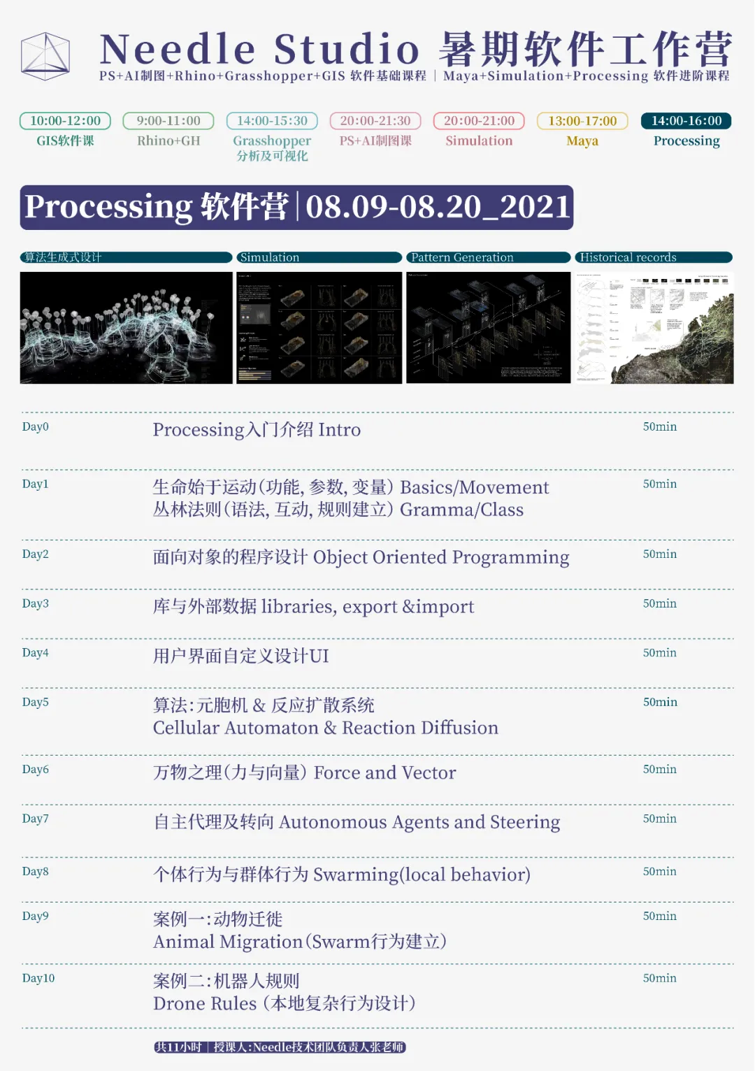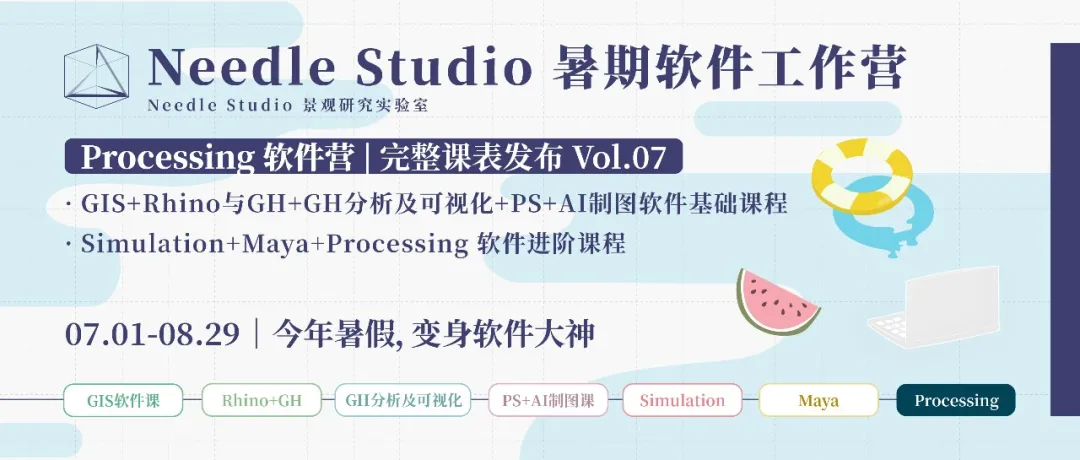 本次暑假軟件工作營包含了基礎(chǔ)課程和進(jìn)階課程。基礎(chǔ)課程包括了景觀學(xué)生必學(xué)的五大軟件:PS+AI+GIS+Rhino+Grasshopper,進(jìn)階課程則涵蓋了可做景觀動(dòng)態(tài)模擬的Simulation課程,可做景觀參數(shù)化編程的Processing課程以及景觀異形建模的Maya課程等。