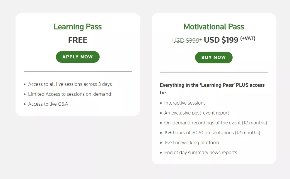專業(yè)通行證:199美元(含增值稅),除免費(fèi)注冊(cè)的權(quán)益外,可參與享受互動(dòng)環(huán)節(jié)、獨(dú)家會(huì)后報(bào)道、一年有效期的主題會(huì)議錄播、一年有效期的2020年15個(gè)多小時(shí)的演講視頻、一對(duì)一的交流機(jī)會(huì)、每日新聞報(bào)道總結(jié)等。