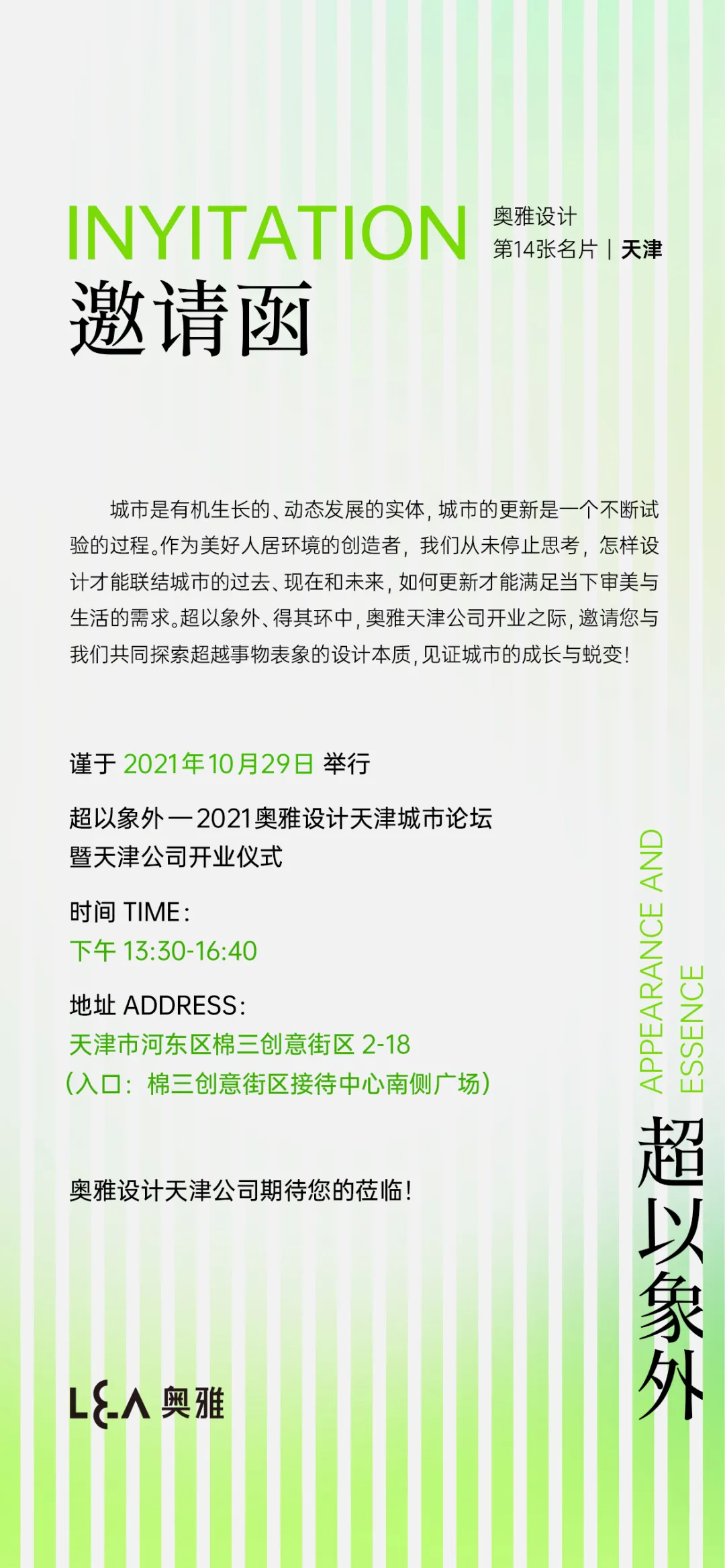2021年10月29日,奧雅設(shè)計天津公司將舉行2021奧雅設(shè)計天津城市論壇暨天津公司開業(yè)儀式,屆時將邀請政府領(lǐng)導(dǎo)、業(yè)界大咖、媒體代表等參會,一起見證奧雅設(shè)計在第14座城市的再次出發(fā)!
