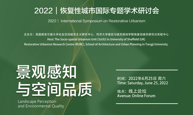 2022 | International Symposium on Restoraitve Urbanism: landscape perception and environmental quality is co-hosted by the Socio-spatial Urbanism Unit (SsUU) in University of Sheffield (UK) and Restorative Urbanism Research Centre (RURC), School of Architecture and Urban Planning in Tongji University. It the first thematic academic forum for overseas outstanding young scholars in relevant arenas including urban planning and design, architecture, and landscape. For this year, academic discussions will be conducted around the topic of "Landscape Perception and Environmental Quality" to integrate available research resources to provide an open platform for young scholars' to discuss and share their ongoing research, and to obtain comments and constructive suggestions from the experienced researchers.