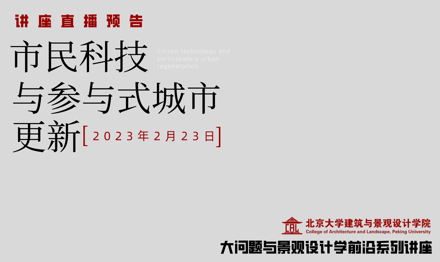 北京大學(xué)建筑與景觀設(shè)計(jì)學(xué)院為風(fēng)景園林碩士專業(yè)學(xué)位和景觀設(shè)計(jì)學(xué)研究生開設(shè)的學(xué)科前沿探討課程。通過邀請高校、研究機(jī)構(gòu)和一線實(shí)踐結(jié)構(gòu)專家分享與景觀設(shè)計(jì)學(xué)(風(fēng)景園林)相關(guān)的學(xué)科、研究領(lǐng)域的理論與實(shí)踐研究,以及方法進(jìn)展;理解國家需求和專業(yè)實(shí)現(xiàn)可能,拓展專業(yè)邊界和新領(lǐng)域,篤定用設(shè)計(jì)服務(wù)國土空間規(guī)劃、生態(tài)保護(hù)修復(fù)、建成環(huán)境改善與民生福祉提升、低碳社會、鄉(xiāng)村振興和行星生態(tài)治理的專業(yè)信心與職業(yè)責(zé)任。